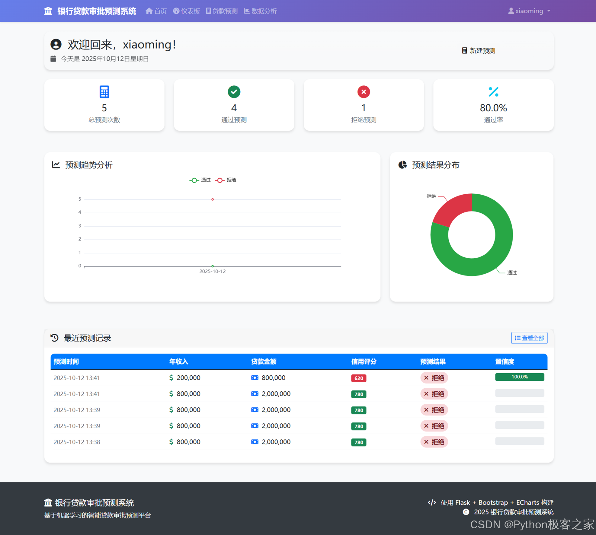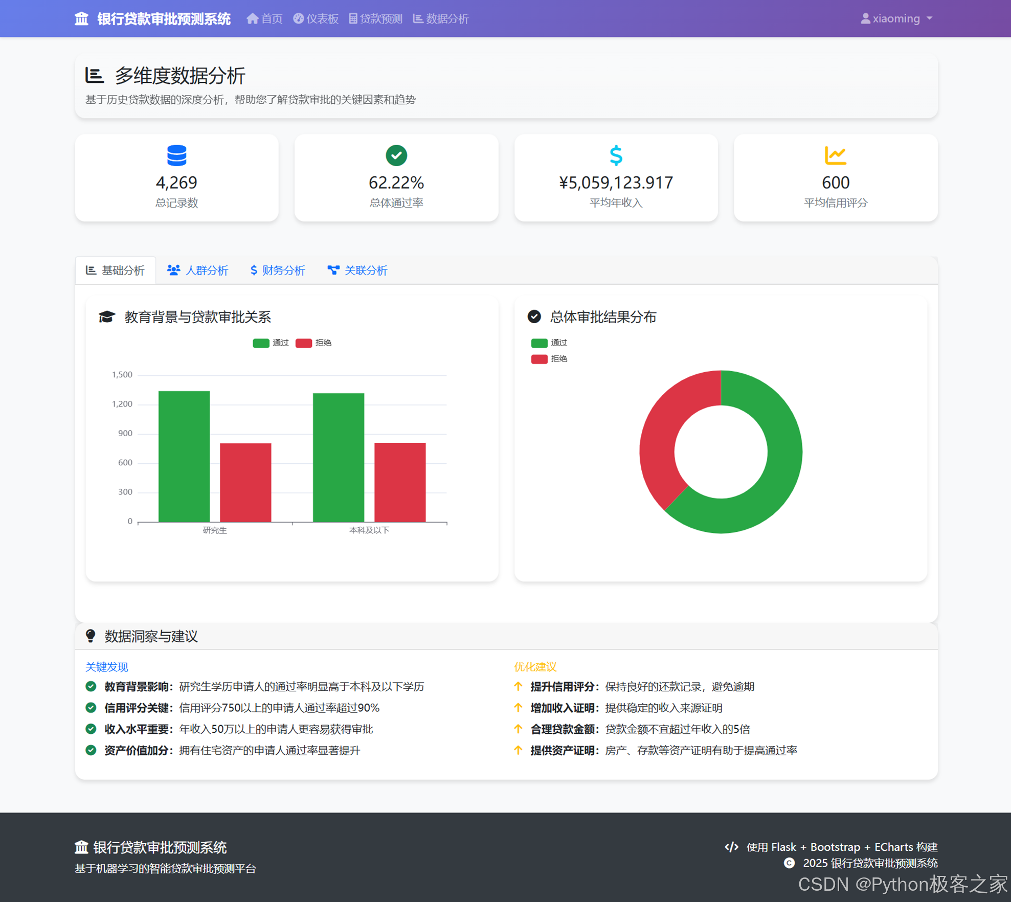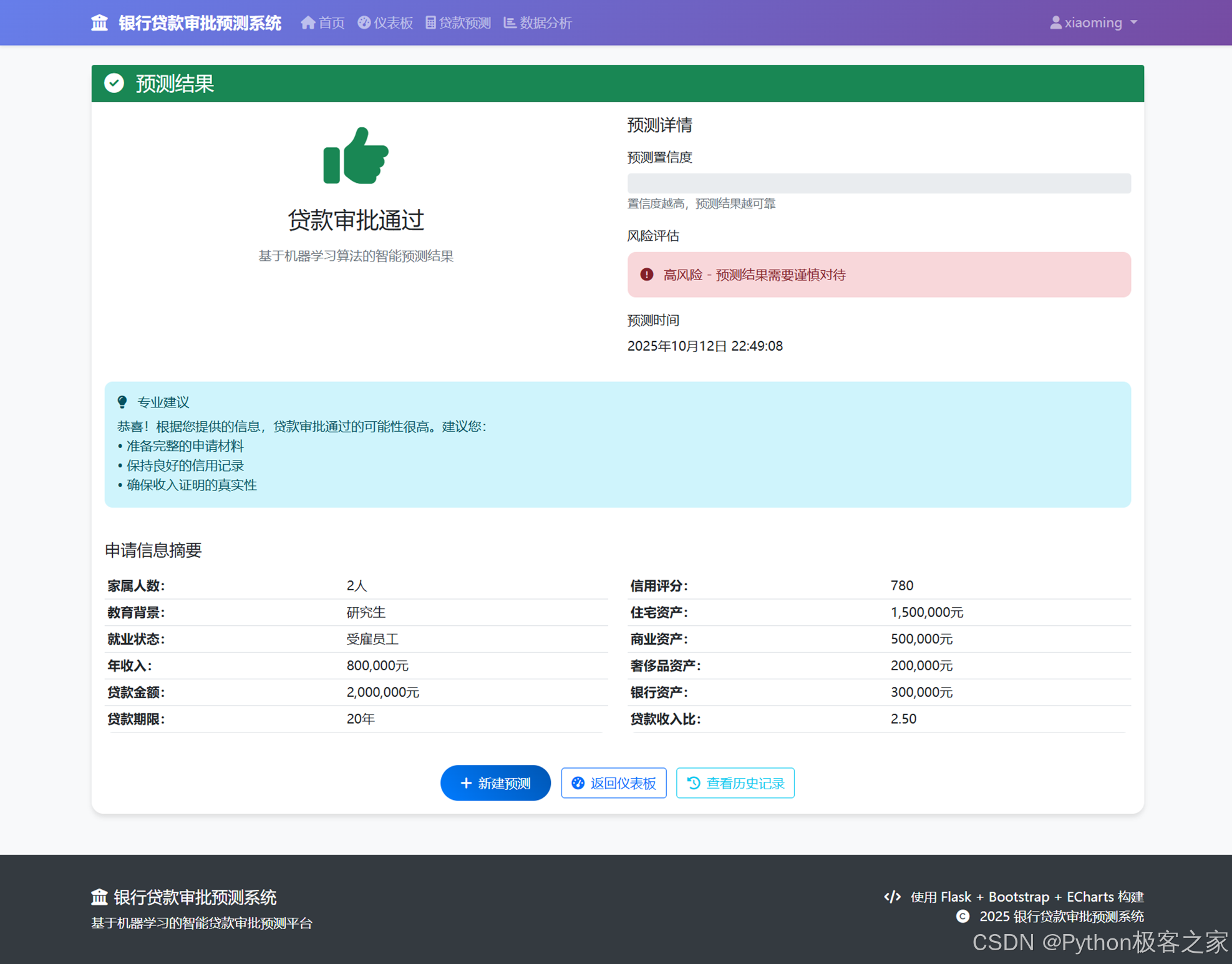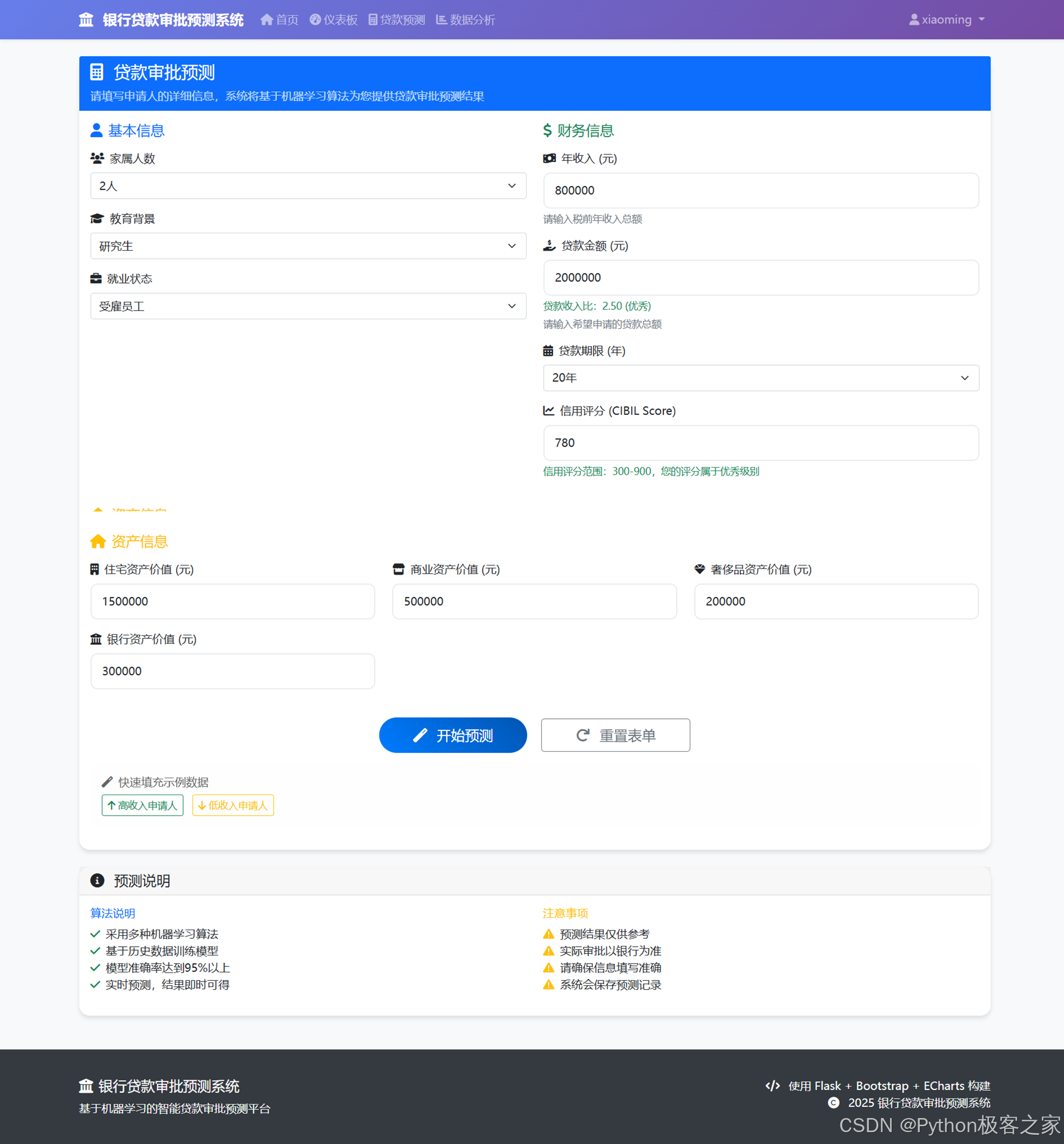 本项目开发了一个基于机器学习的银行贷款审批预测系统,采用Flask框架构建Web应用。系统通过分析申请人的信用评分、收入、资产等10余项特征数据,使用XGBoost等5种算法进行建模,最终实现90%以上的预测准确率。系统包含数据可视化、用户管理、智能预测等功能模块,为银行提供高效的风险评估工具。关键技术包括:Python数据处理、Sklearn机器学习、Bootstrap前端开发等。该方案有效提升了贷款审批效率,降低了金融机构的坏账风险。