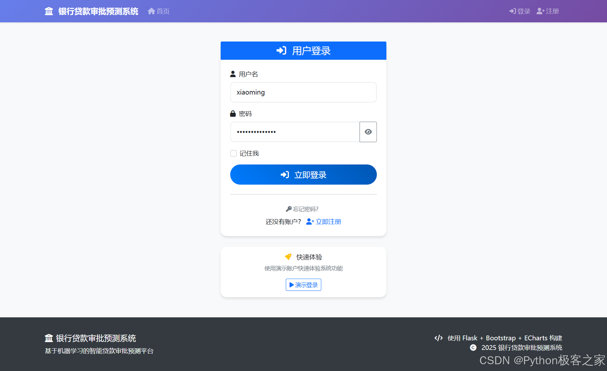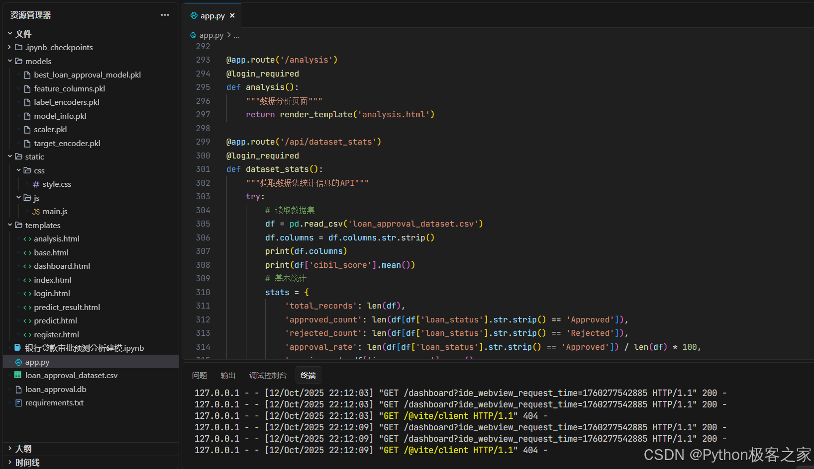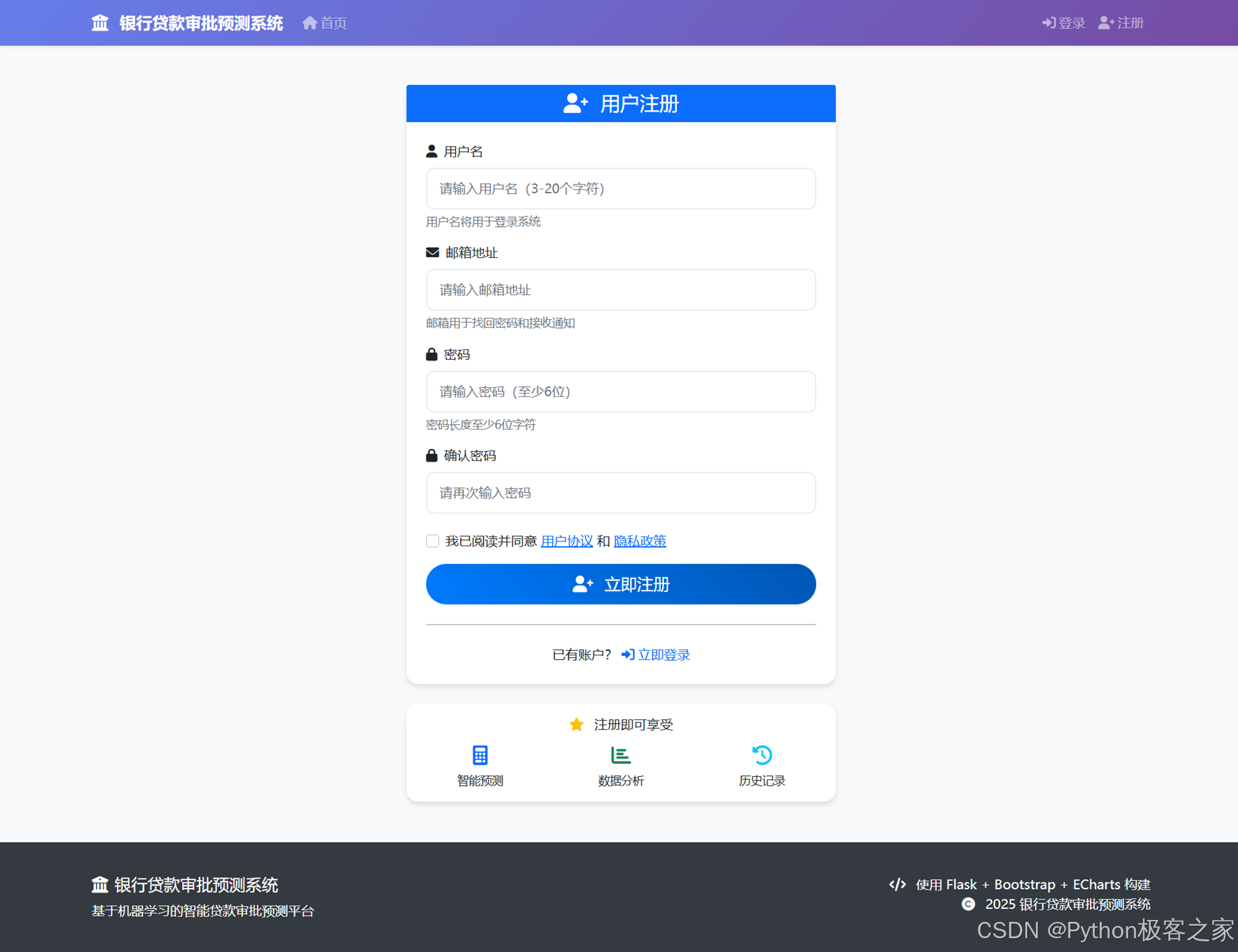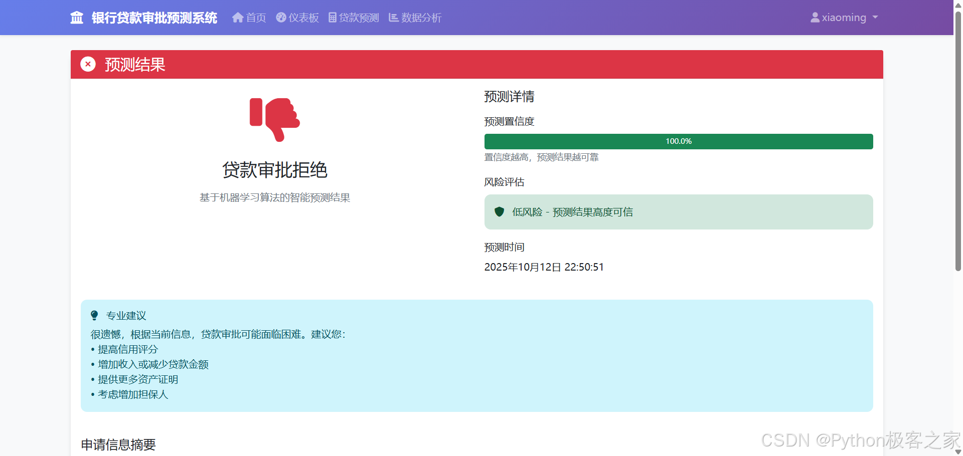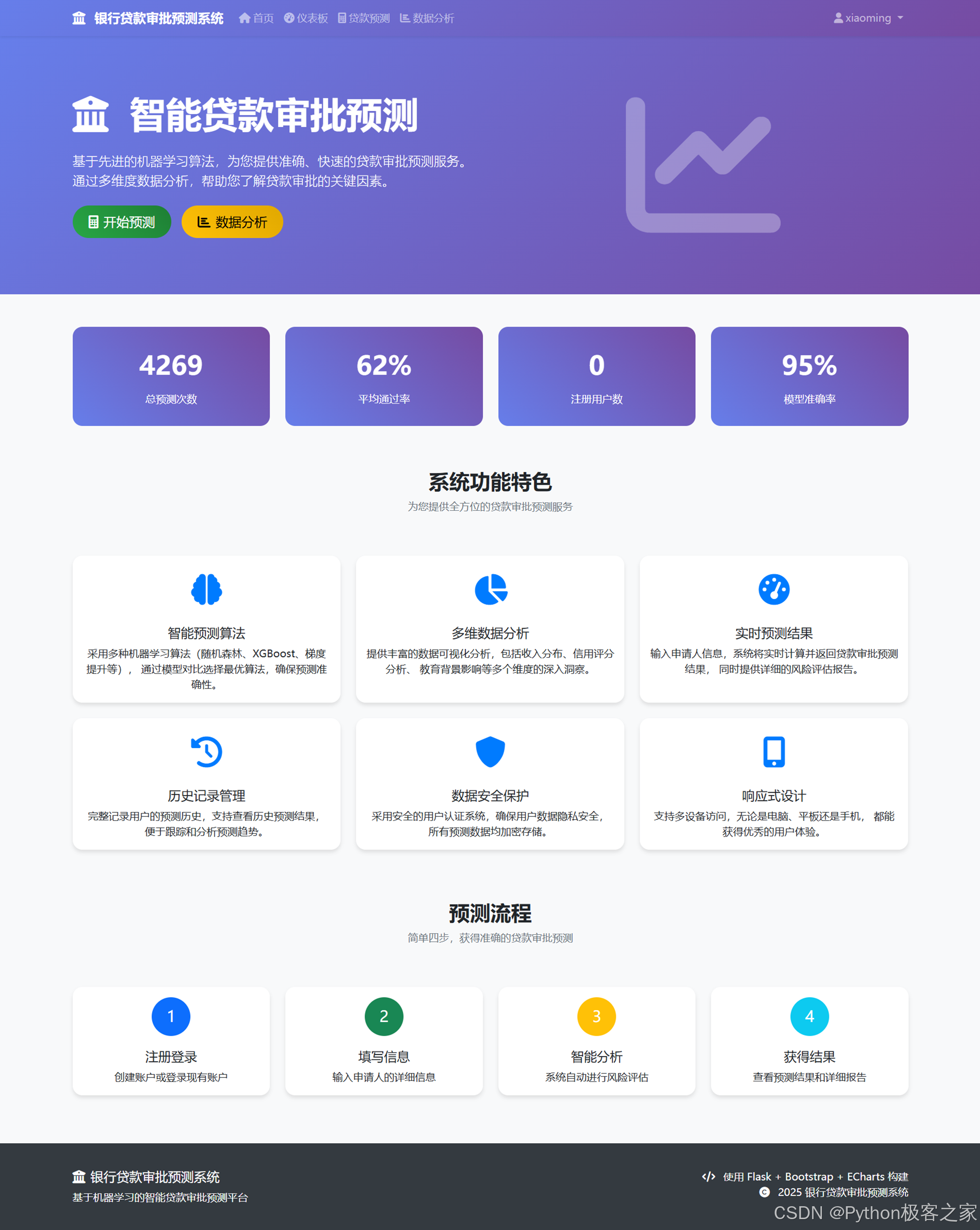 本项目开发了一个基于机器学习的银行贷款审批预测系统,采用Flask框架构建Web应用。系统通过分析申请人的信用评分、收入、资产等10余项特征数据,使用XGBoost等5种算法进行建模,最终实现90%以上的预测准确率。系统包含数据可视化、用户管理、智能预测等功能模块,为银行提供高效的风险评估工具。关键技术包括:Python数据处理、Sklearn机器学习、Bootstrap前端开发等。该方案有效提升了贷款审批效率,降低了金融机构的坏账风险。