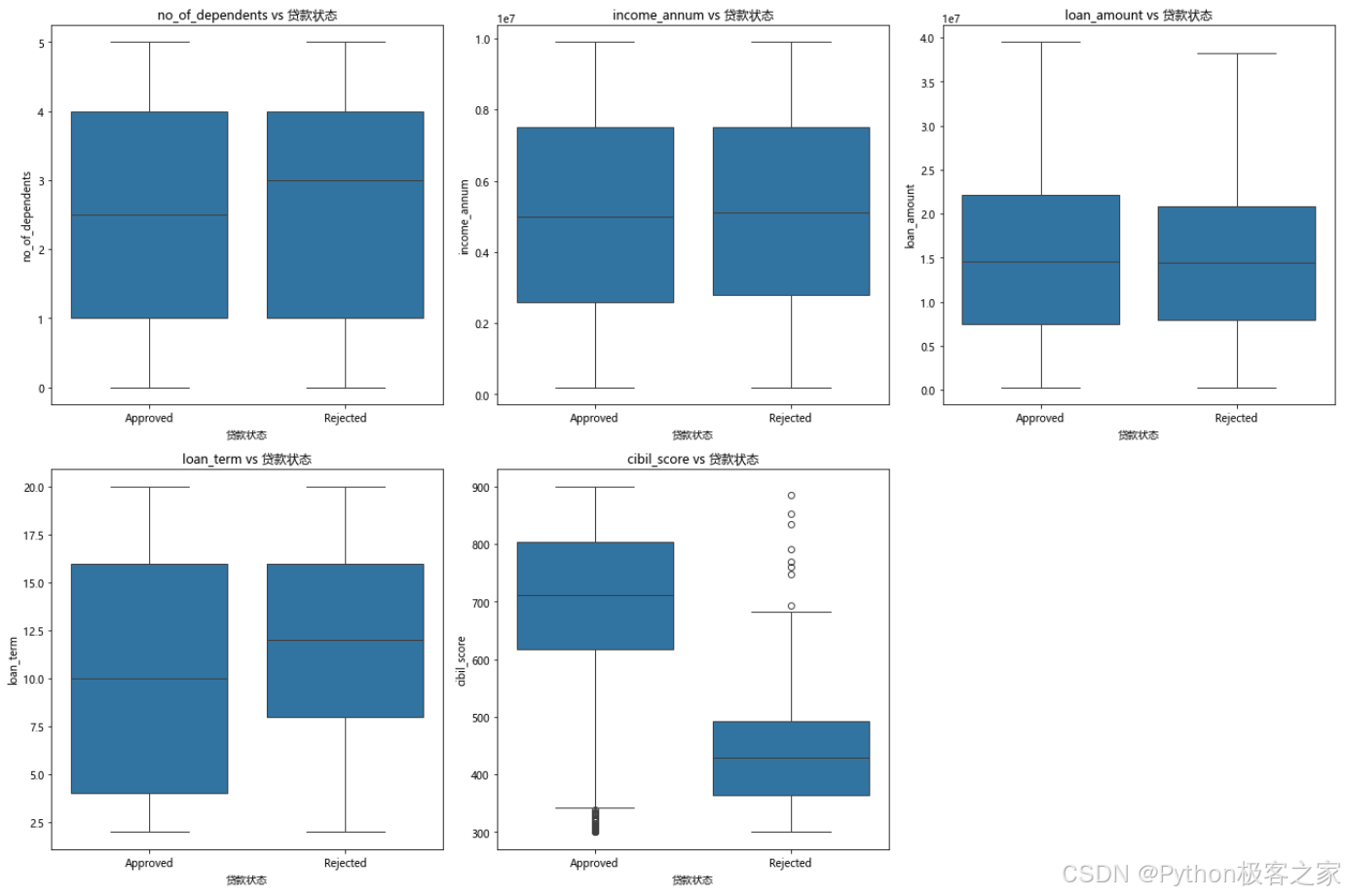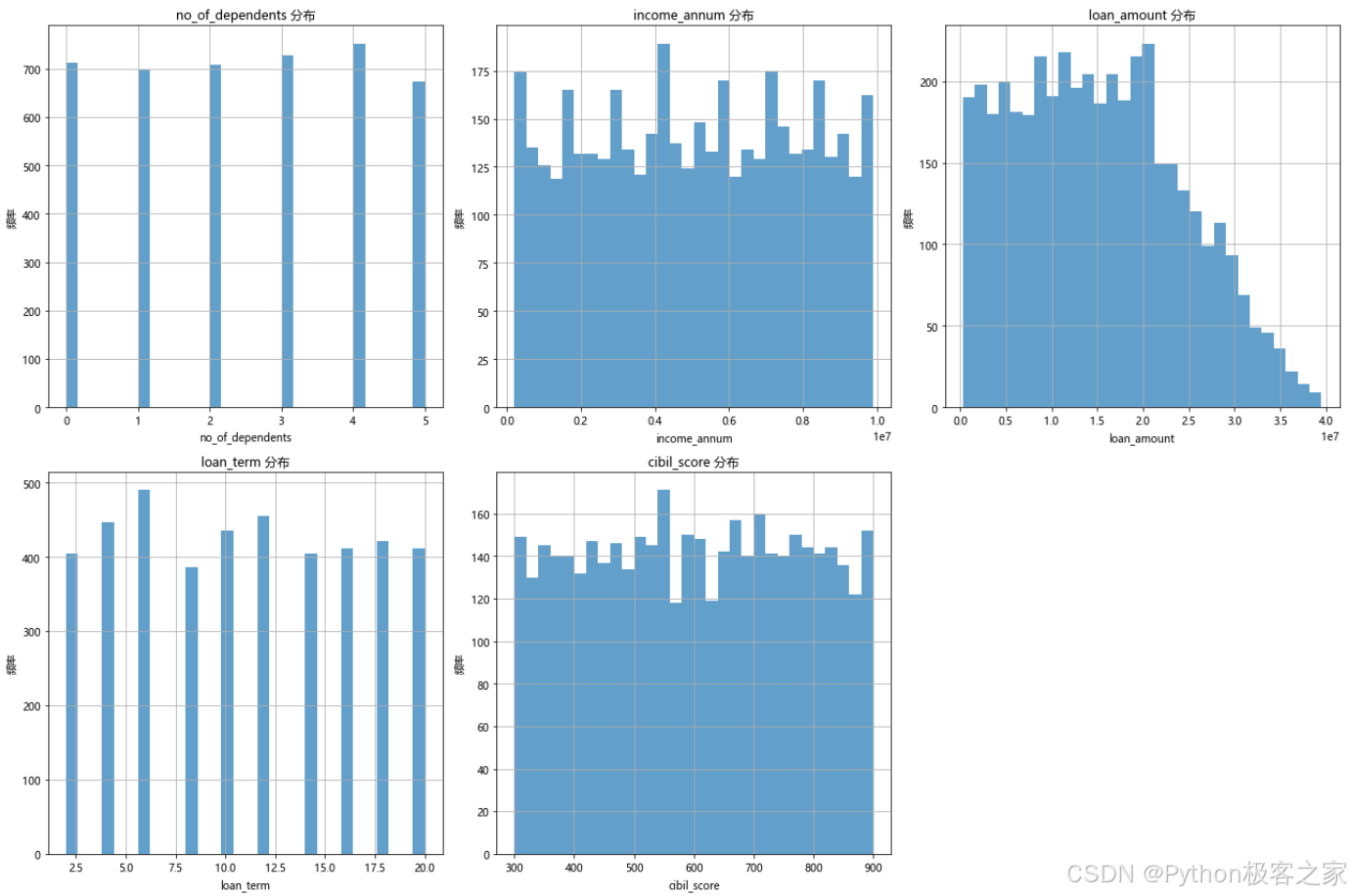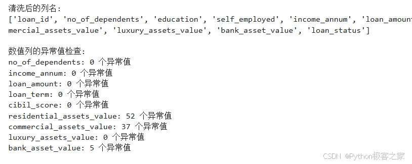 for col in numeric_columns:if col != 'loan_id':Q1 = df[col].quantile(0.25)Q3 = df[col].quantile(0.75)IQR = Q3 - Q1lower_bound = Q1 - 1.5 * IQRupper_bound = Q3 + 1.5 * IQRoutliers = df[(df[col] < lower_bound) | (df[col] > upper_bound)]print(f"{col}: {len(outliers)} 个异常值")