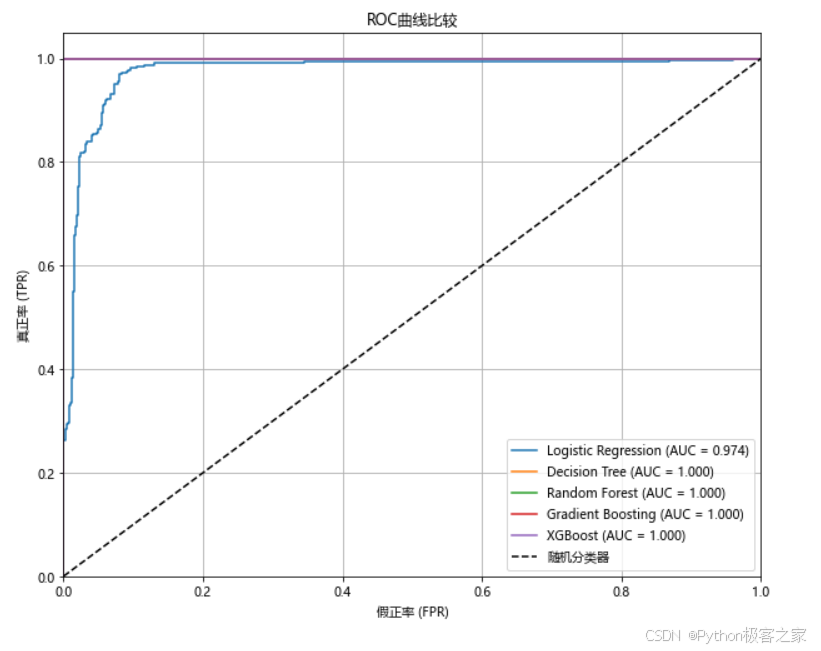 模型训练与比较: 训练了多个机器学习模型,包括逻辑回归、决策树、随机森林、梯度提升和XGBoost,并进行了全面的性能比较。