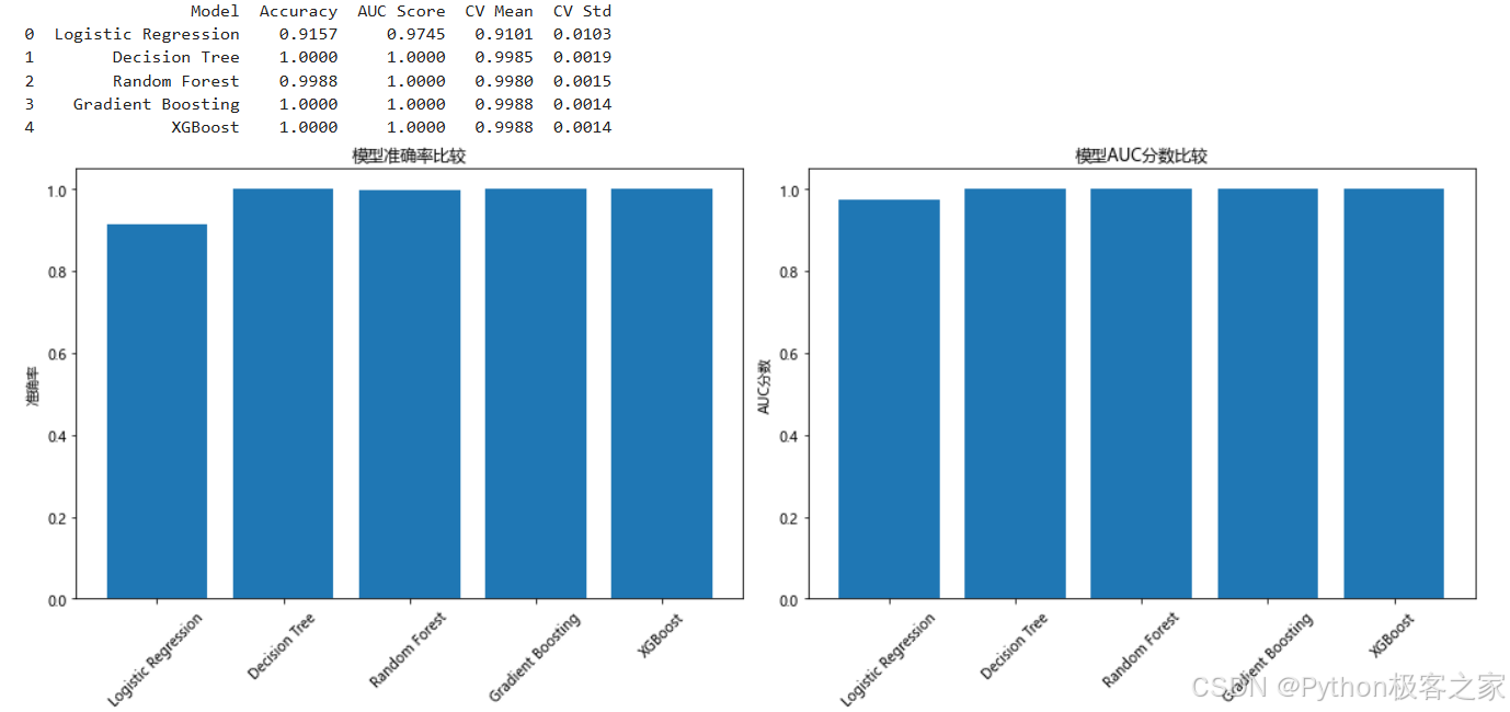 model_results = {}for name, model in models.items():print(f"\n训练 {name}...")# 训练模型、预测、评估指标、交叉验证......model_results[name] = {'model': model,'accuracy': accuracy,'auc_score': auc_score,'cv_mean': cv_scores.mean(),'cv_std': cv_scores.std(),'y_pred': y_pred,'y_pred_proba': y_pred_proba}print(f"准确率: {accuracy:.4f}")print(f"AUC分数: {auc_score:.4f}")print(f"交叉验证准确率: {cv_scores.mean():.4f} (+/- {cv_scores.std() * 2:.4f})")