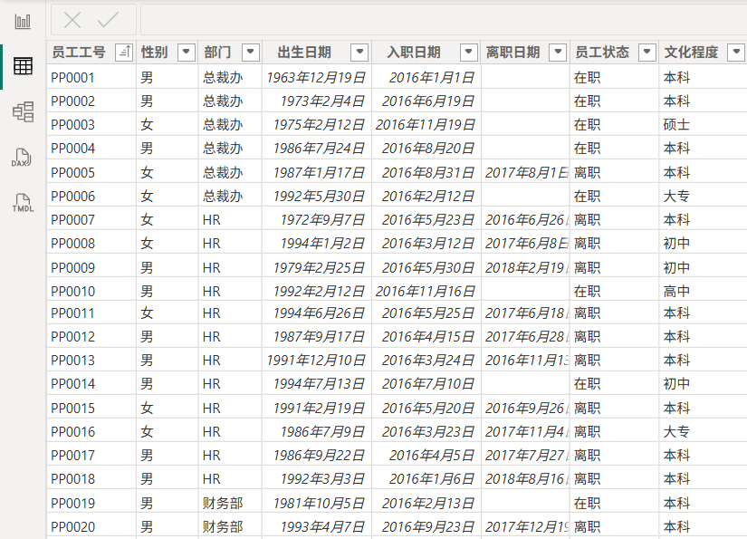 我们可以在'表格视图'查看导入到Power BI中的人员信息表的数据