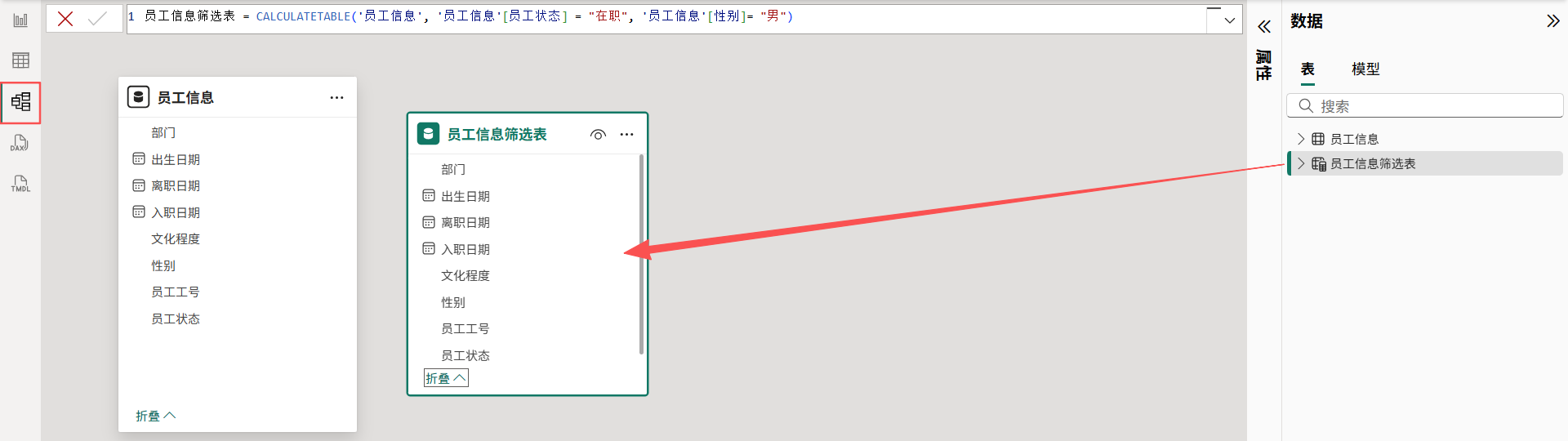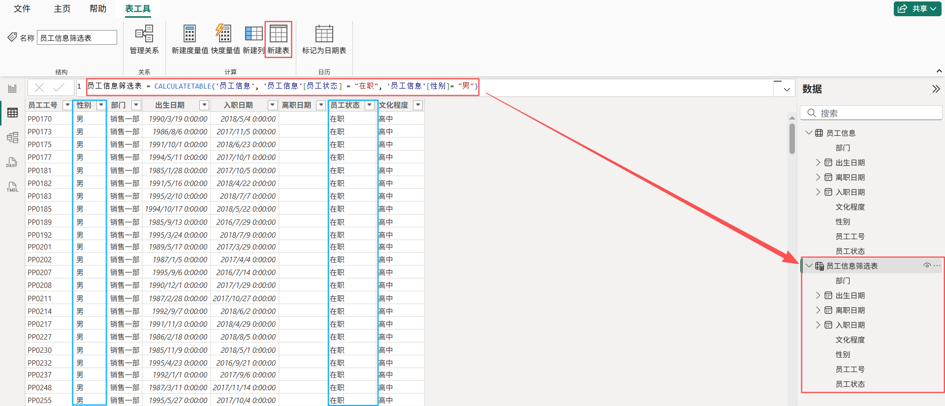 步骤2:在菜单栏中选择"新建表",输入公式 员工信息筛选表 = CALCULATETABLE('员工信息', '员工信息'[员工状态] = "在职", '员工信息'[性别]= "男"),结果如下图所示