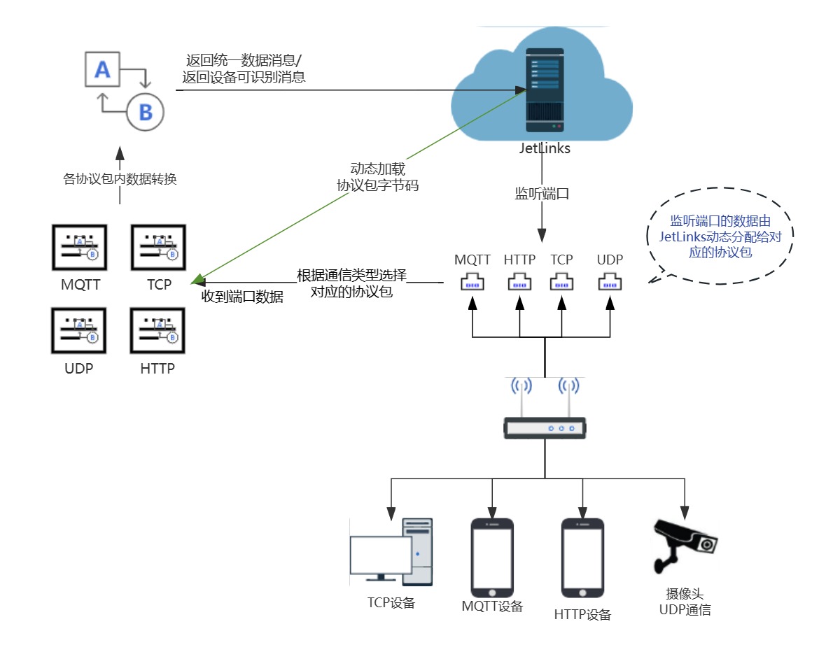 JetLinks IOT 是一个开源的、企业级的物联网平台,它集成了设备管理、数据安全通信、消息订阅、规则引擎等一系列物联网核心能力,支持以平台适配设备的方式连接海量设备,采集设备数据上云,提供云端API,通过调用云端API实现远程控制。JetLinks物联网平台还支持多种设备接入协议,并提供了丰富的协议库。