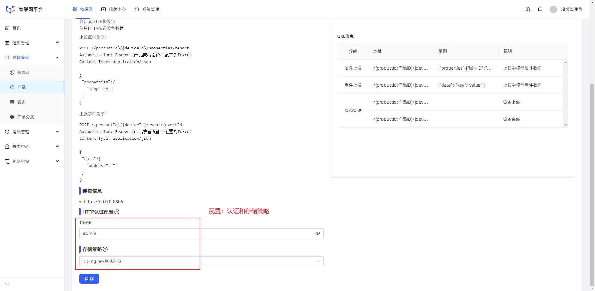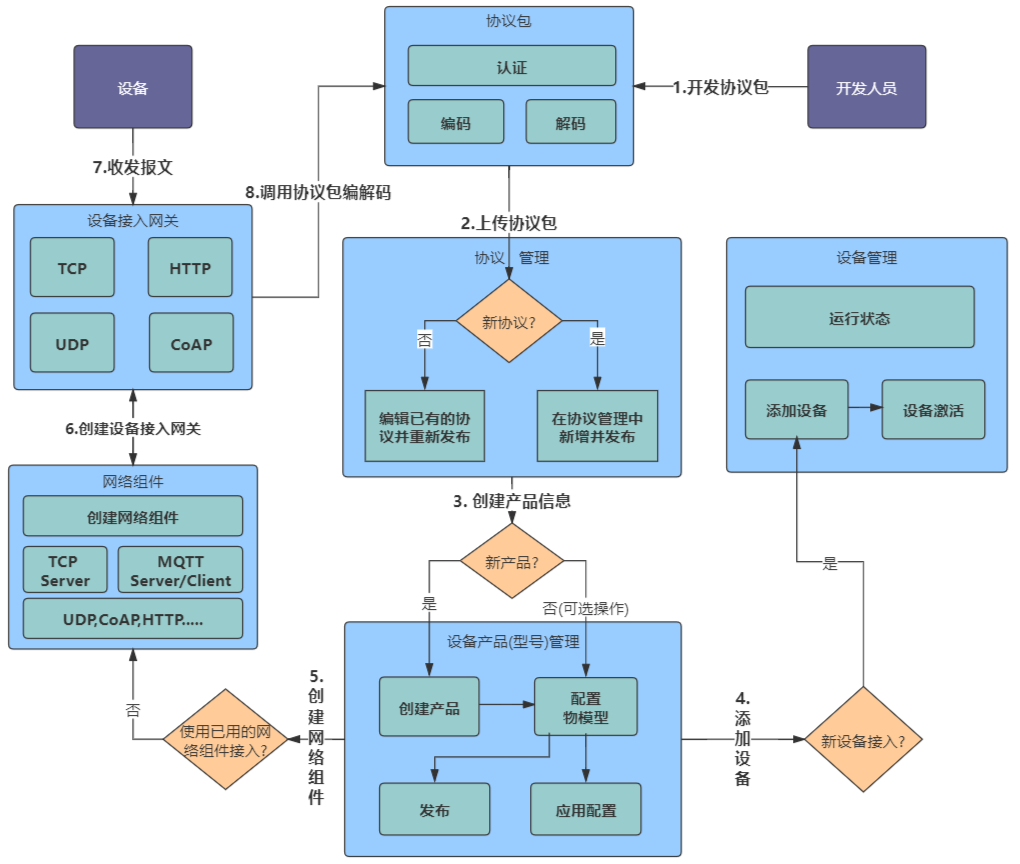 设备连接层:支持MQTT、TCP、UDP、CoAP、HTTP、WebSocket协议,提供统一设备接入的能力。