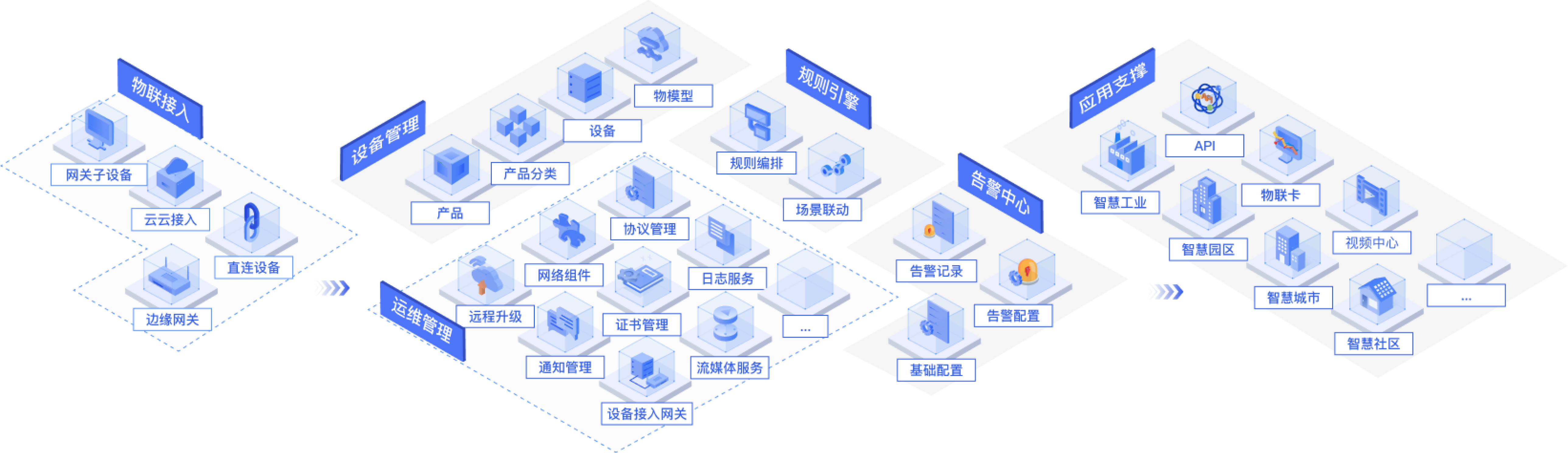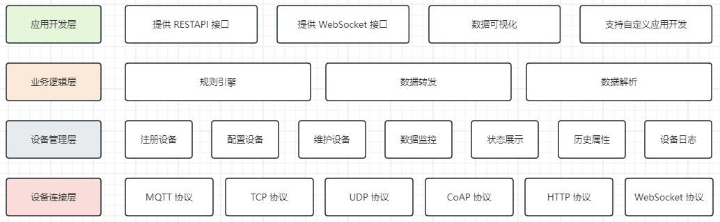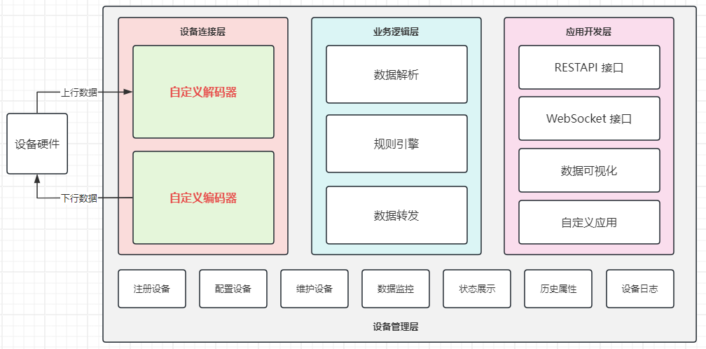 设备管理层:提供设备注册、配置、维护和监控的功能,支持设备属性、状态实时展示和历史属性、设备日志记录查询等。