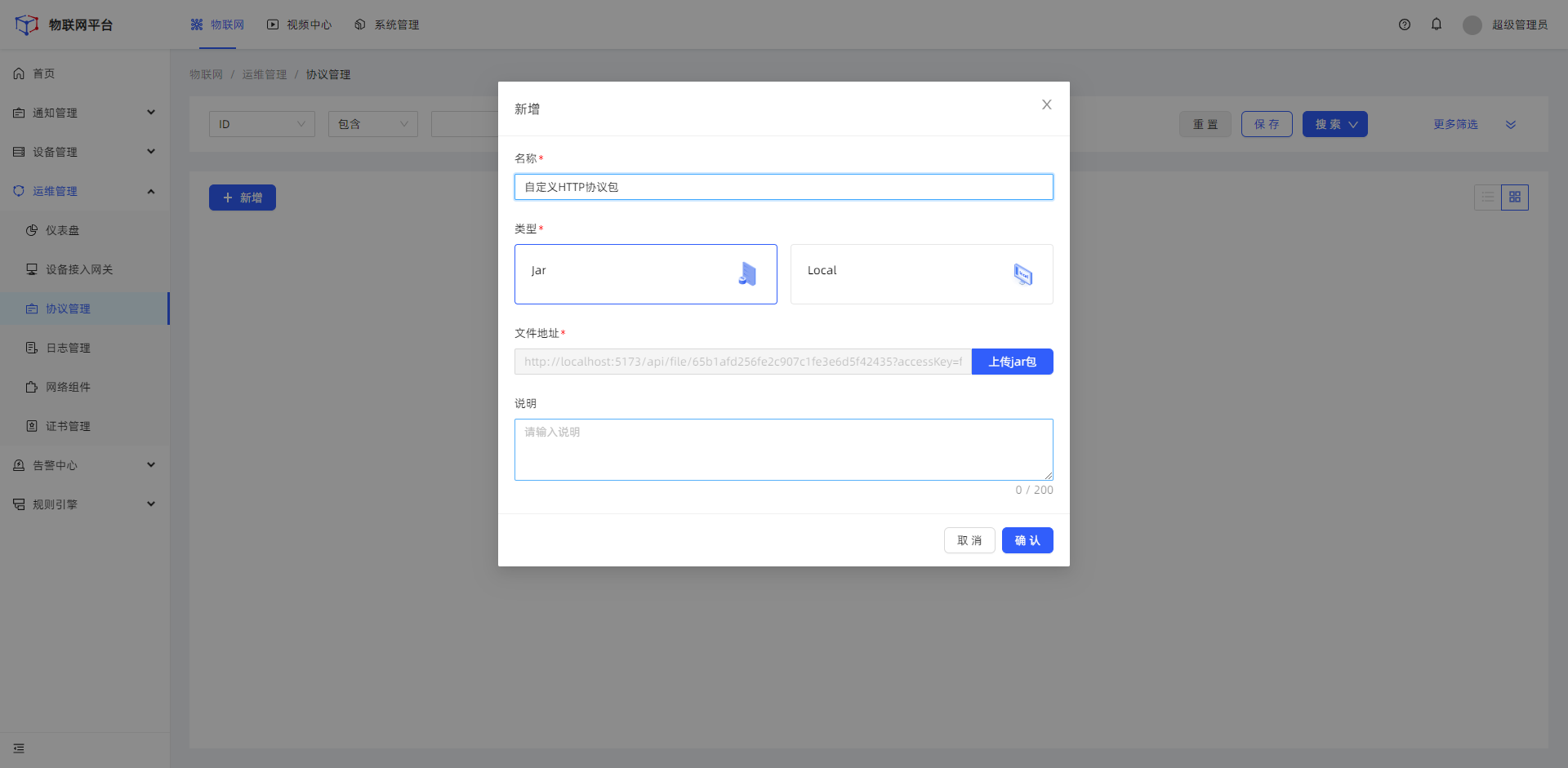 前端逻辑:将步骤1 的响应结果拼接成:文件地址(用户不可编辑)+ 用户填写的协议包基本信息(名称、类型、说明)