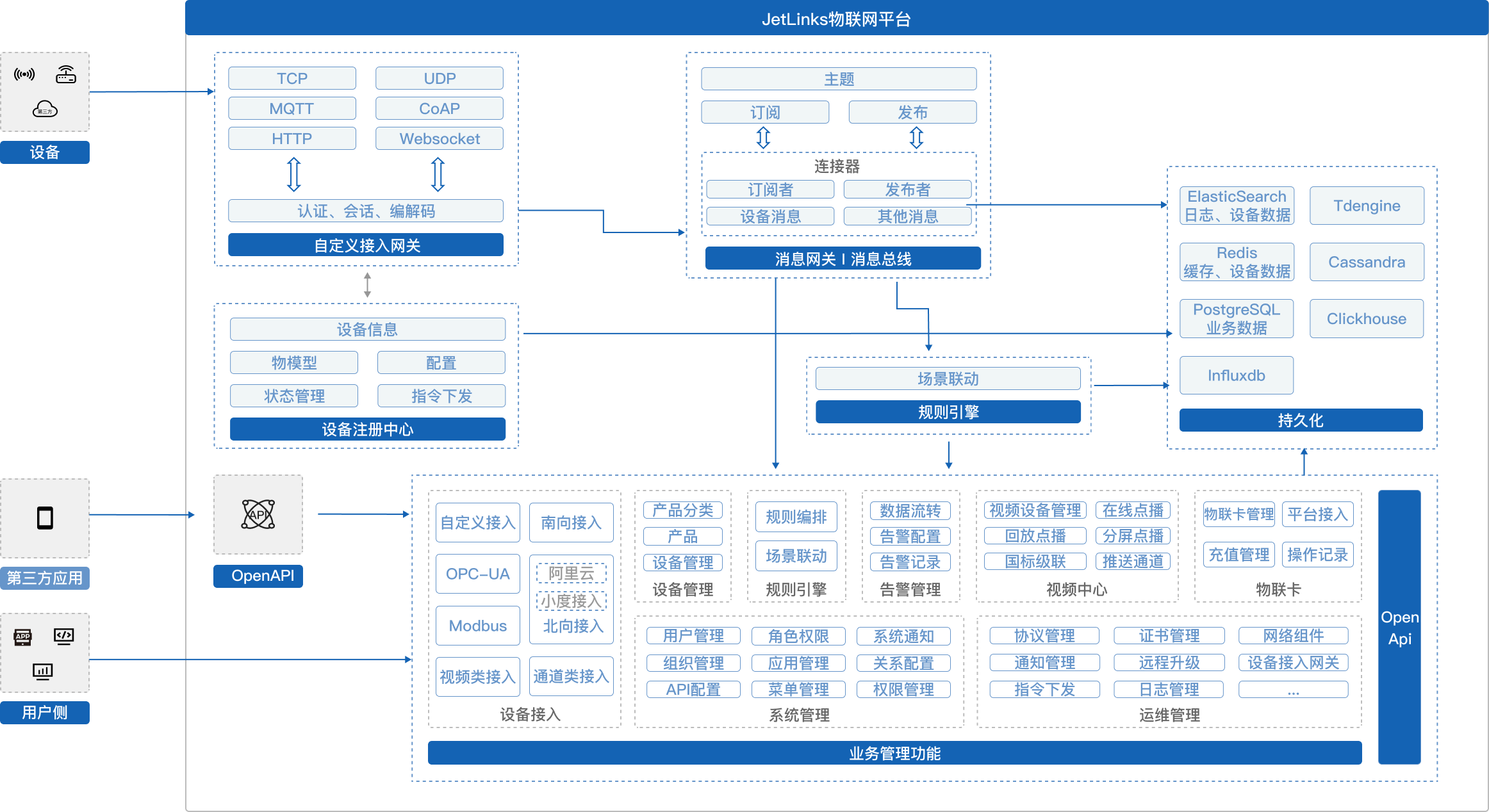 业务逻辑层:提供规则引擎、数据转发和数据解析等功能,支持多种业务场景下的数据处理和交互操作。