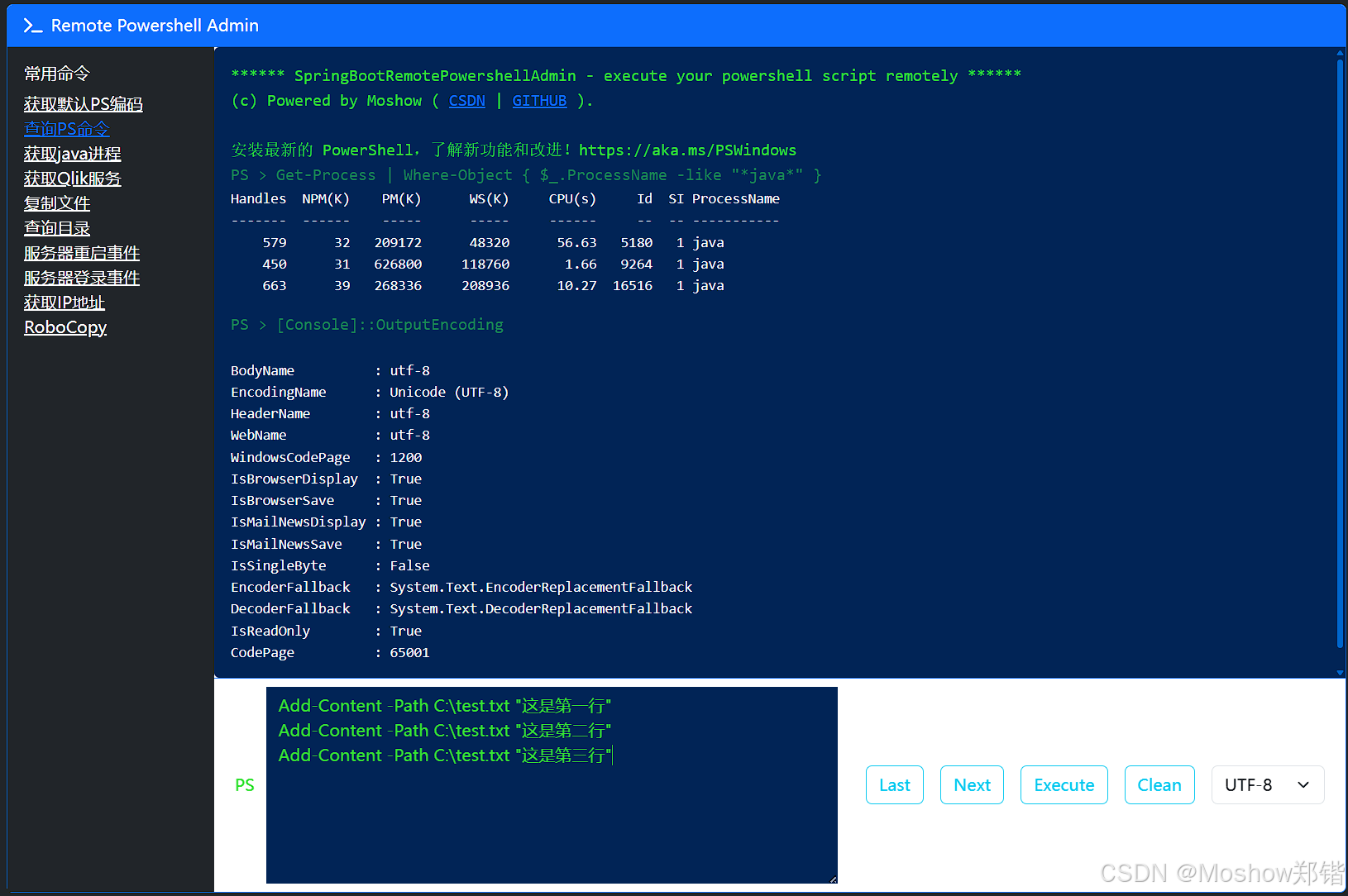 项目已开源在 GitHub:https://github.com/moshowgame/SpringBootRemotePowershellAdmin如果你有需求,或发现 Bug,欢迎提 Issue/PR~觉得好用的话,别忘了给个 Star,让更多人看到这个轻量运维工具!