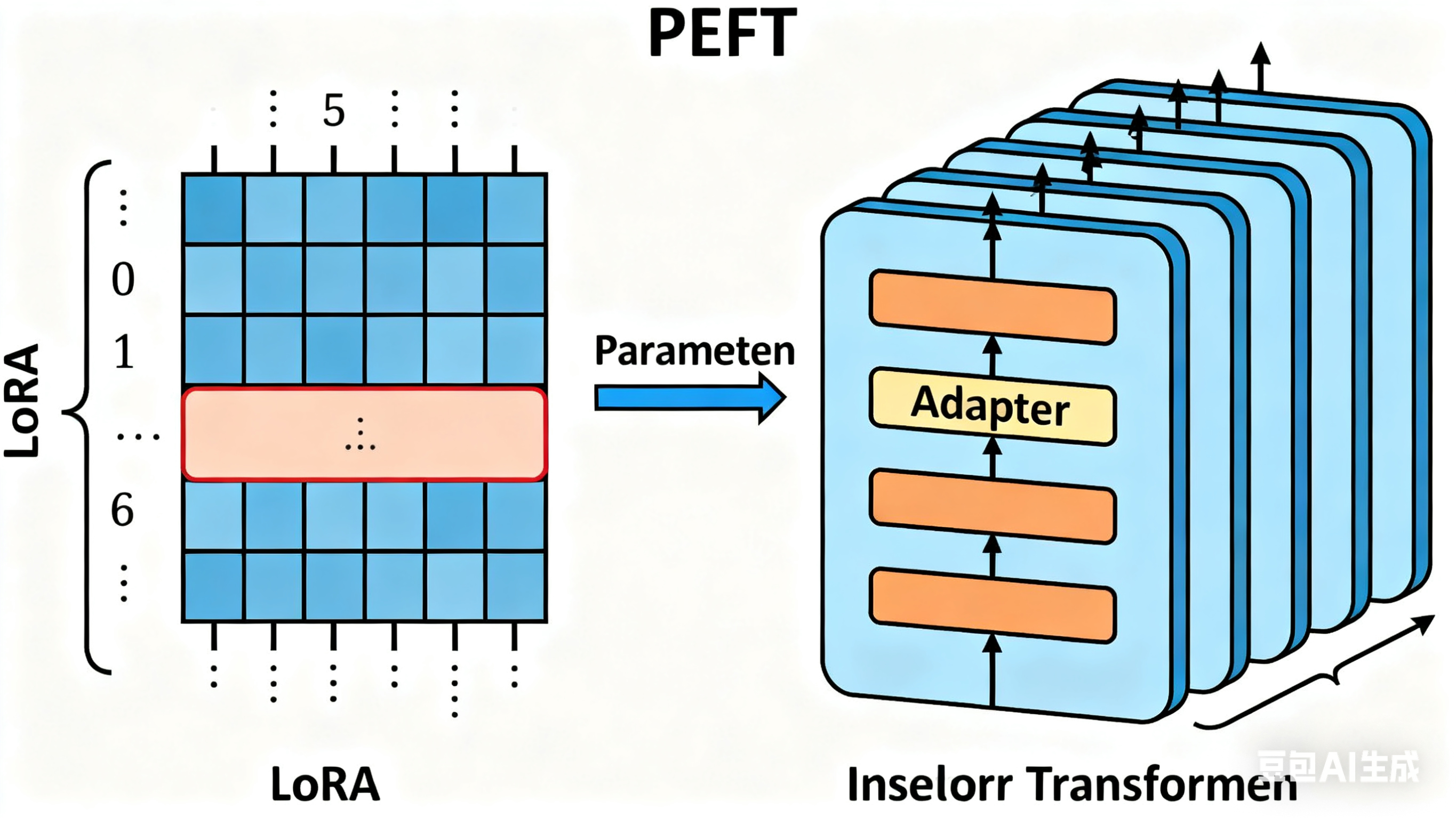 高效微调 PEFT,作为一种新兴且极具潜力的微调策略,其核心思想在于巧妙地冻结预训练模型的大部分参数,仅针对少量新增或修改的参数进行训练 。在传统的全参数微调中,模型所有参数都参与训练,这就好比对一座已经建好的大厦进行全面翻修,不仅耗费巨大的人力、物力(对应计算资源),而且在某些情况下还可能破坏大厦原本稳定的结构(导致过拟合等问题)。而 PEFT 则像是对大厦的关键区域进行针对性改造,既保留了大厦整体的稳定性(预训练模型的泛化能力),又能高效地满足新的功能需求(适配特定任务)。