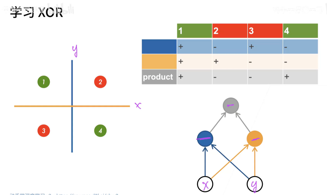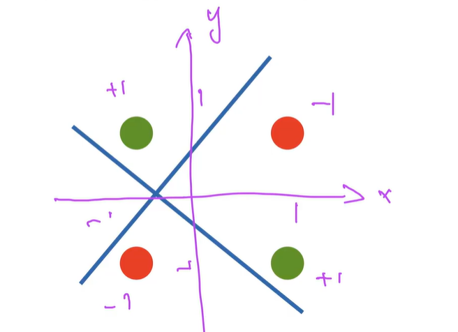 x,y代表样本的两个维度,中间层记录样本分类结果,输出层也为样本分类结果;类似于两个函数相加得到的结果