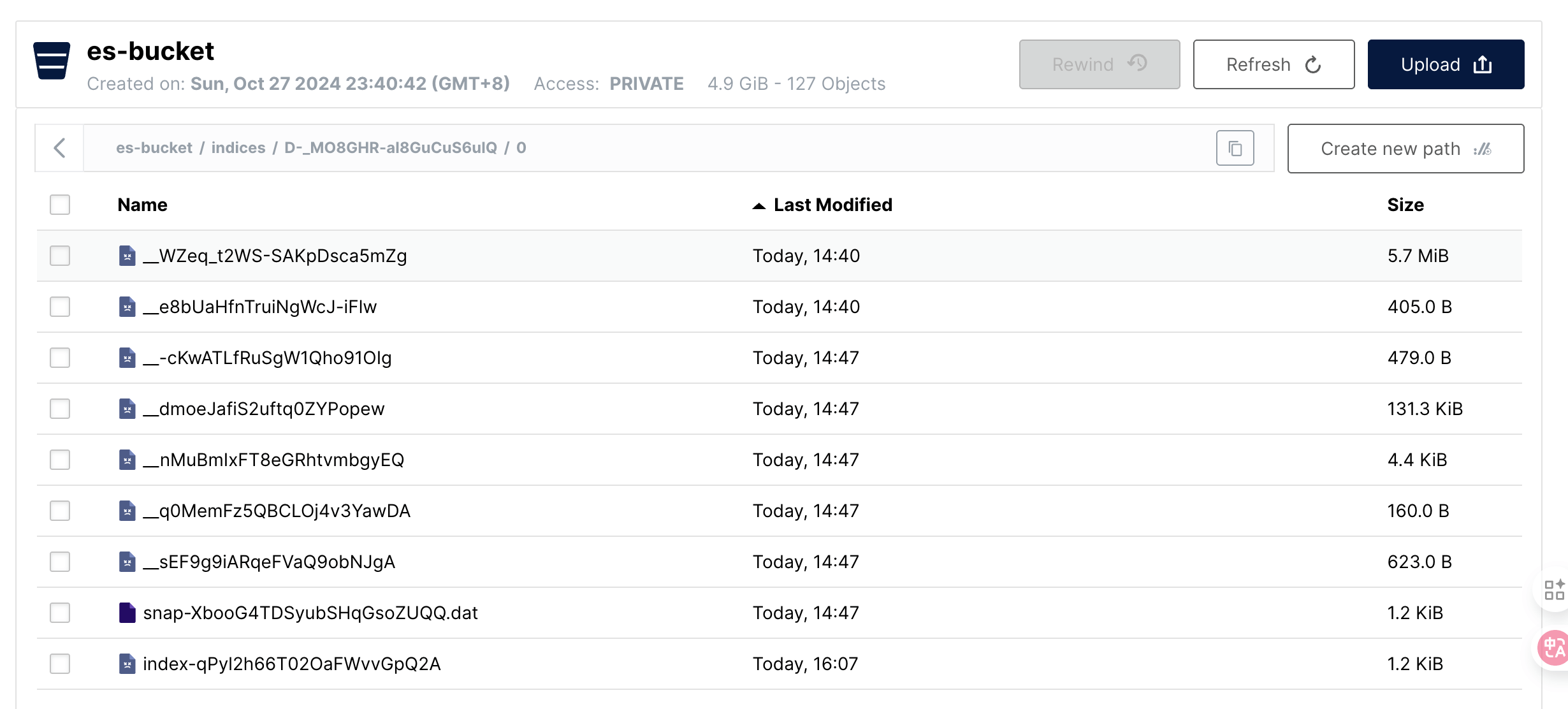 而在 MinIO 中,我们也可以找到大小相应的数据文件,注意一下这里的文件时间是备份的时间点。