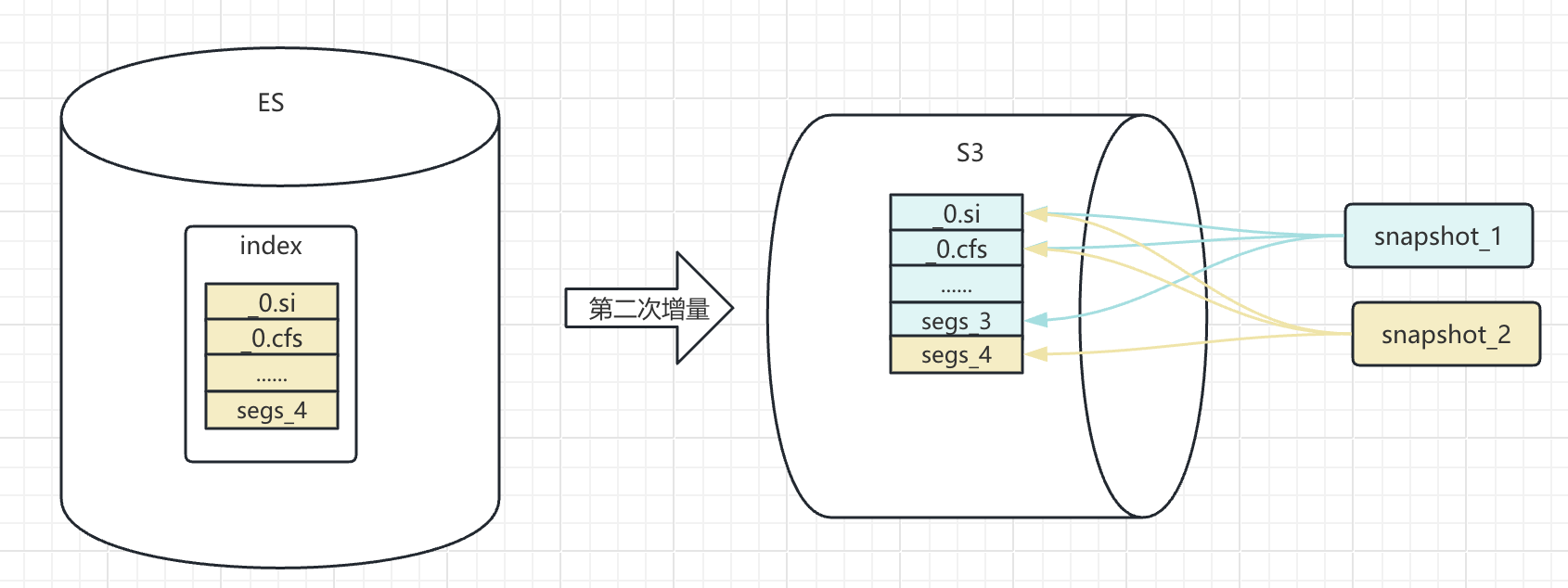 在同一备份仓库中为同一索引创建第二次快照时,Elasticsearch 并不会复制所有数据,而是通过校验和精准识别出哪些文件发生了变化,仅备份这些增量文件。该机制的巧妙之处在于,每次快照并非简单追加文件,而是会维护一个独立的文件关系映射,构成该时间点完整数据所需的全部文件(包括来自之前快照的未变文件),从而保证了每次快照的独立性和可恢复性。