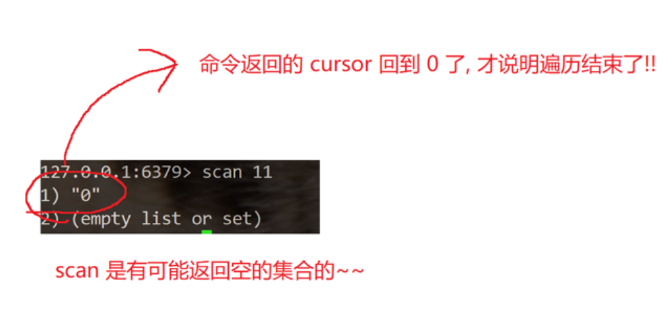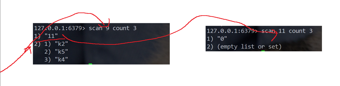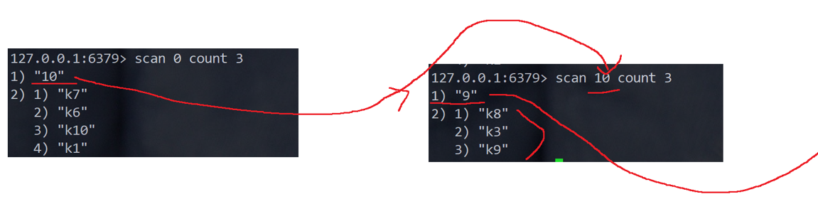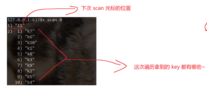 注意这两张图片是连在一起的,看返回值,返回是告诉你下一次要从哪里开始遍历,这个程序员也看不懂,redis服务器懂就行,只需要知道下一次遍历从这里开始就行