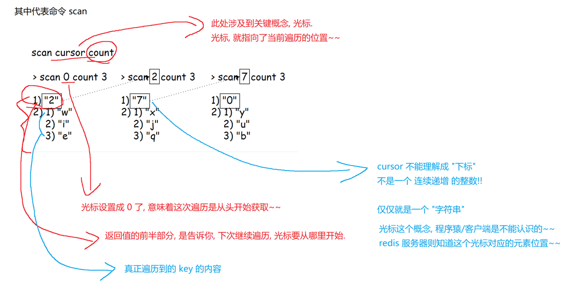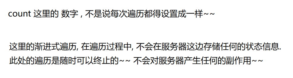 渐进式:不是一个命令,把所有的key都拿到,而是每执行一次命令,只获取到其中的一小部分,这样的话能够保证当前这一次操作不会太卡,要想得到所有的key就需要多次遍历了,多次执行渐进式遍历命令