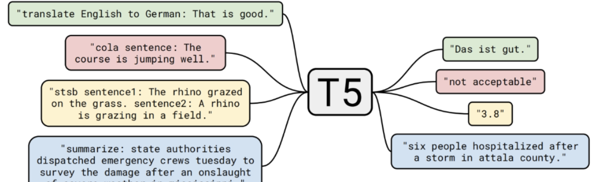接收一段文本输入,并生成一段文本输出。将纷繁复杂的NLP任务统一到一个简单的文本到文本框架下。