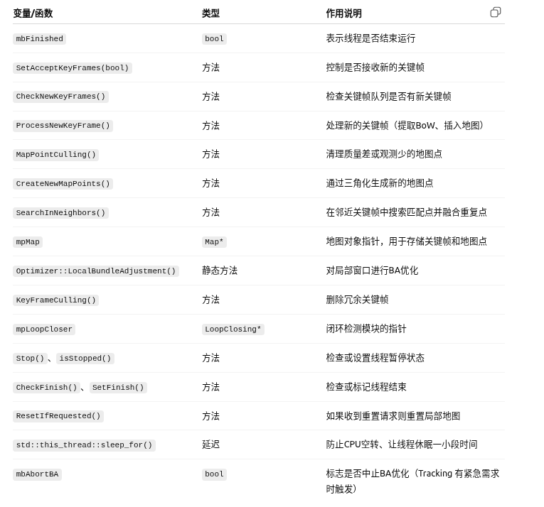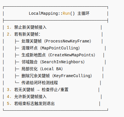 该函数是局部建图线程的主循环函数,在系统运行期间持续执行,负责: