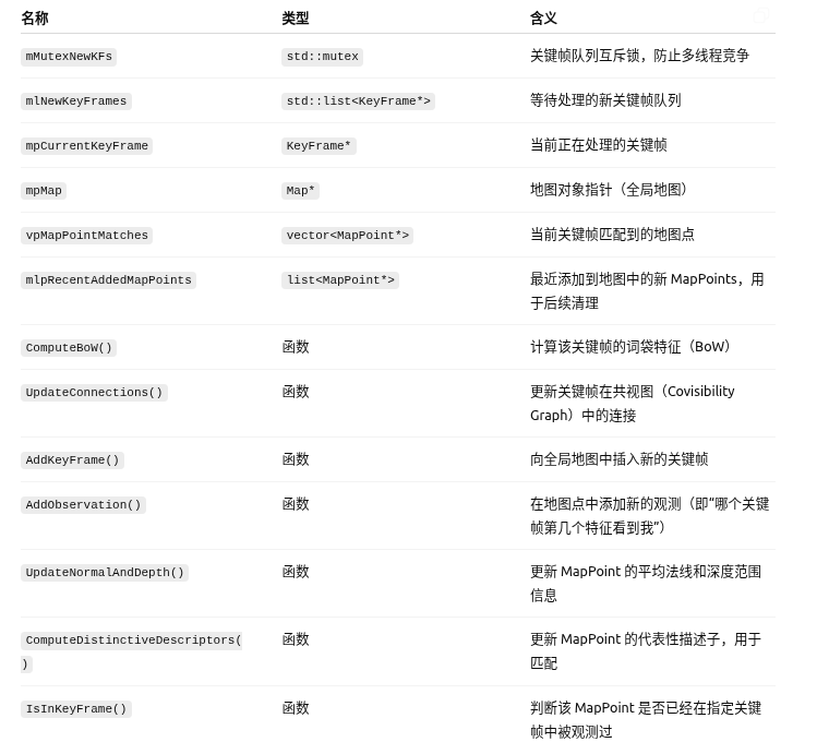 将从Tracking线程传来的新关键帧正式插入地图,并建立其与已有MapPoints的关联关系,更新共视图(Covisibility Graph),为后续地图点生成、优化和闭环检测打好基础。
