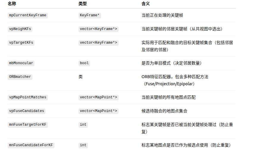 void LocalMapping::SearchInNeighbors() {// Retrieve neighbor keyframesint nn = 10;if(mbMonocular)nn=20;const vector<KeyFrame*> vpNeighKFs = mpCurrentKeyFrame->GetBestCovisibilityKeyFrames(nn);//实际用于匹配和融合的目标关键帧集合vector<KeyFrame*> vpTargetKFs;for(vector<KeyFrame*>::const_iterator vit=vpNeighKFs.begin(), vend=vpNeighKFs.end(); vit!=vend; vit++){KeyFrame* pKFi = *vit;//mnFuseTargetForKF:标志某地图点是否已作为候选点使用if(pKFi->isBad() || pKFi->mnFuseTargetForKF == mpCurrentKeyFrame->mnId)continue;vpTargetKFs.push_back(pKFi);pKFi->mnFuseTargetForKF = mpCurrentKeyFrame->mnId;// Extend to some second neighbors,扩展到邻居的邻居const vector<KeyFrame*> vpSecondNeighKFs = pKFi->GetBestCovisibilityKeyFrames(5);for(vector<KeyFrame*>::const_iterator vit2=vpSecondNeighKFs.begin(), vend2=vpSecondNeighKFs.end(); vit2!=vend2; vit2++){KeyFrame* pKFi2 = *vit2;if(pKFi2->isBad() || pKFi2->mnFuseTargetForKF==mpCurrentKeyFrame->mnId || pKFi2->mnId==mpCurrentKeyFrame->mnId)continue;vpTargetKFs.push_back(pKFi2);}}// Search matches by projection from current KF in target KFsORBmatcher matcher;vector<MapPoint*> vpMapPointMatches = mpCurrentKeyFrame->GetMapPointMatches();for(vector<KeyFrame*>::iterator vit=vpTargetKFs.begin(), vend=vpTargetKFs.end(); vit!=vend; vit++){KeyFrame* pKFi = *vit;matcher.Fuse(pKFi,vpMapPointMatches);}// Search matches by projection from target KFs in current KFvector<MapPoint*> vpFuseCandidates;vpFuseCandidates.reserve(vpTargetKFs.size()*vpMapPointMatches.size());for(vector<KeyFrame*>::iterator vitKF=vpTargetKFs.begin(), vendKF=vpTargetKFs.end(); vitKF!=vendKF; vitKF++){KeyFrame* pKFi = *vitKF;vector<MapPoint*> vpMapPointsKFi = pKFi->GetMapPointMatches();for(vector<MapPoint*>::iterator vitMP=vpMapPointsKFi.begin(), vendMP=vpMapPointsKFi.end(); vitMP!=vendMP; vitMP++){MapPoint* pMP = *vitMP;if(!pMP)continue;if(pMP->isBad() || pMP->mnFuseCandidateForKF == mpCurrentKeyFrame->mnId)continue;pMP->mnFuseCandidateForKF = mpCurrentKeyFrame->mnId;vpFuseCandidates.push_back(pMP);}}matcher.Fuse(mpCurrentKeyFrame,vpFuseCandidates);// Update pointsvpMapPointMatches = mpCurrentKeyFrame->GetMapPointMatches();for(size_t i=0, iend=vpMapPointMatches.size(); i<iend; i++){MapPoint* pMP=vpMapPointMatches[i];if(pMP){if(!pMP->isBad()){pMP->ComputeDistinctiveDescriptors();pMP->UpdateNormalAndDepth();}}}// Update connections in covisibility graphmpCurrentKeyFrame->UpdateConnections(); }