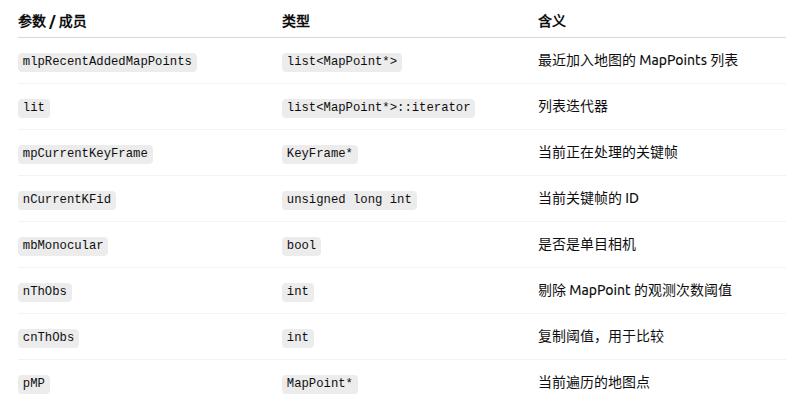 void LocalMapping::MapPointCulling() {// Check Recent Added MapPointslist<MapPoint*>::iterator lit = mlpRecentAddedMapPoints.begin();const unsigned long int nCurrentKFid = mpCurrentKeyFrame->mnId;//判定新加进来的地图点是否可靠的最少观测次数int nThObs;if(mbMonocular)nThObs = 2;elsenThObs = 3;const int cnThObs = nThObs;while(lit!=mlpRecentAddedMapPoints.end()){MapPoint* pMP = *lit;if(pMP->isBad()){lit = mlpRecentAddedMapPoints.erase(lit);}//GetFoundRatio()表示该MapPoint被Tracking成功匹配的比例else if(pMP->GetFoundRatio()<0.25f ){pMP->SetBadFlag();lit = mlpRecentAddedMapPoints.erase(lit);}//如果当前关键帧ID与首次创建关键帧ID相差≥2,并且该点的观测次数≤cnThObselse if(((int)nCurrentKFid-(int)pMP->mnFirstKFid)>=2 && pMP->Observations()<=cnThObs){pMP->SetBadFlag();lit = mlpRecentAddedMapPoints.erase(lit);}//如果当前关键帧ID与首次创建关键帧ID相差≥3else if(((int)nCurrentKFid-(int)pMP->mnFirstKFid)>=3)lit = mlpRecentAddedMapPoints.erase(lit);elselit++;} }