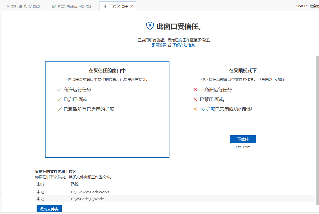 如果没有的话,VSCode 没有自动检测到 ESP-IDF 环境,并且弹出“扩展二等分”对话框,提示某些扩展被禁用。这表明 VSCode 可能进入了一种调试模式(扩展二等分,Extension Bisect),用于排查扩展冲突问题。