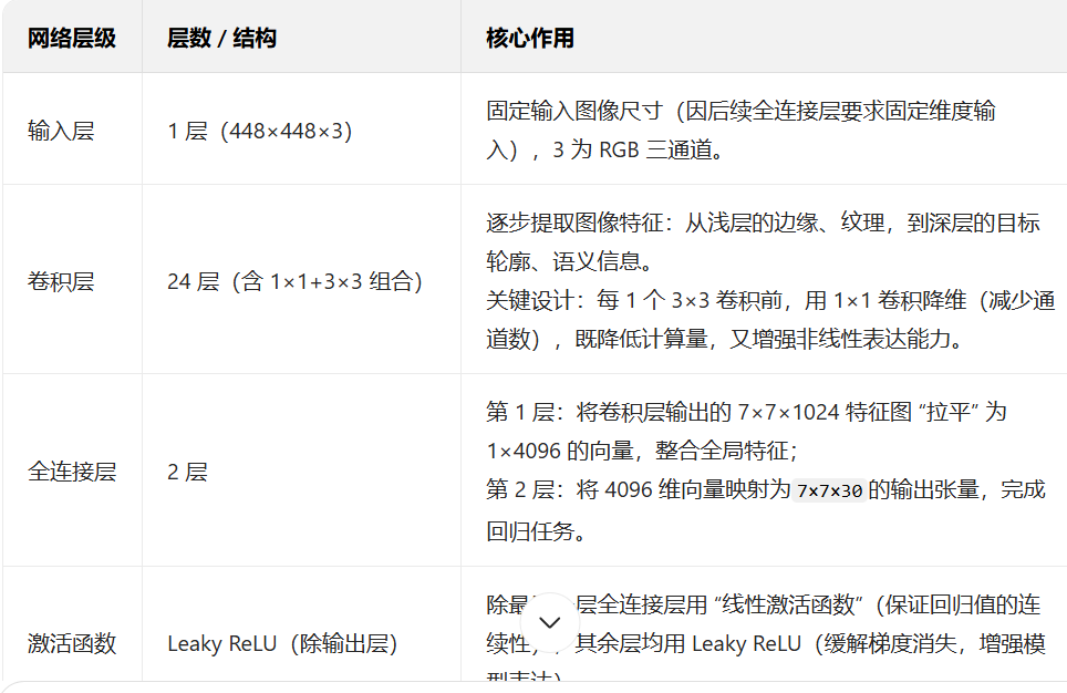 YOLO v1 的网络架构借鉴了 GoogLeNet 的设计思路,但简化了 Inception 模块,改用 “1×1 卷积降维 + 3×3 卷积提特征” 的组合,核心目标是高效提取图像特征,并通过全连接层完成回归任务。