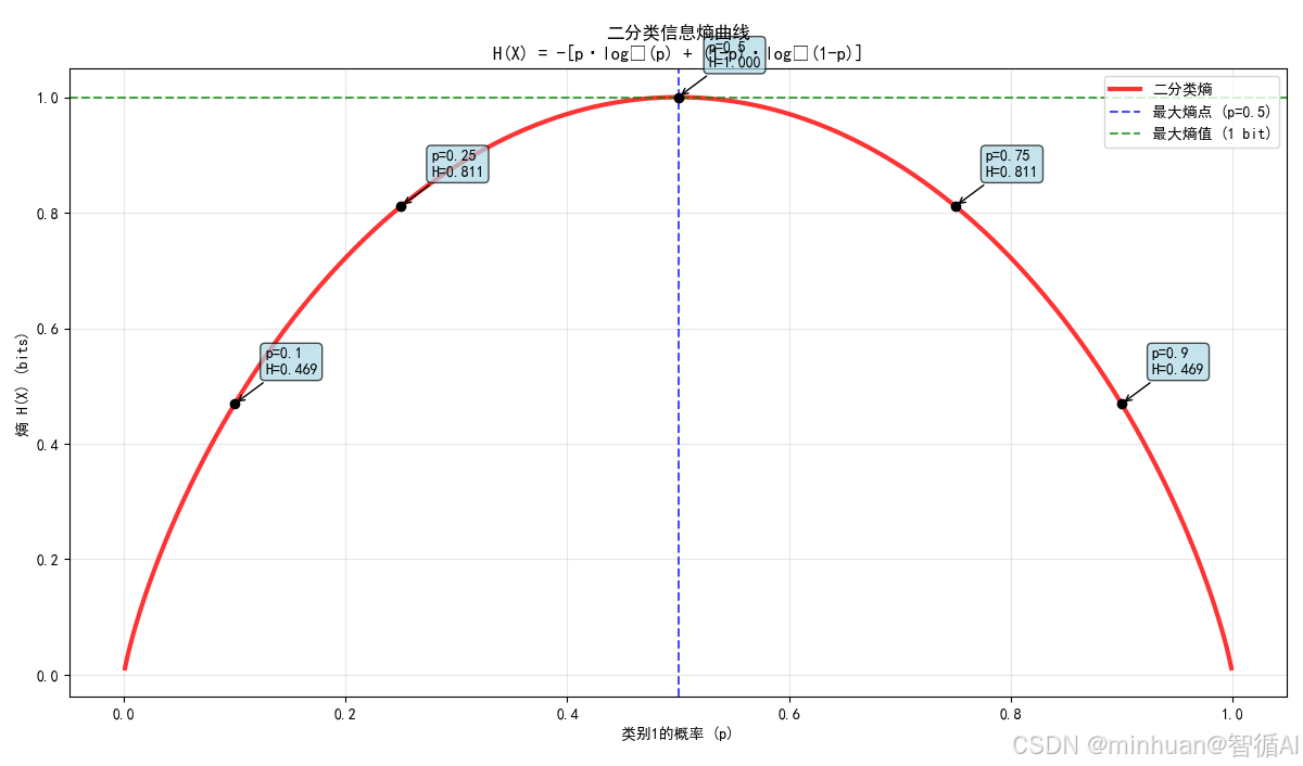 plt.axhline(y=1.0, color='green', linestyle='--', alpha=0.7, label='最大熵值 (1 bit)')plt.xlabel('类别1的概率 (p)')