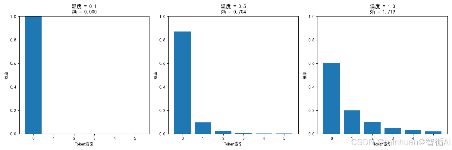 print(f"{'温度':<8} {'熵':<8} {'最大概率':<12} {'有效token数':<15}")