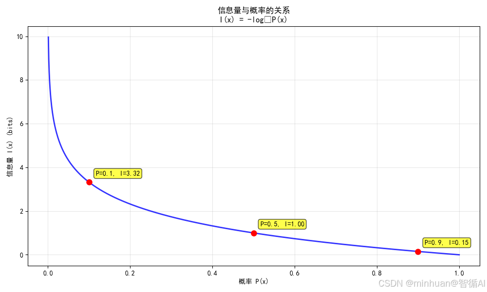 for p in key_points:info = information_content(p)plt.plot(p, info, 'ro', markersize=8)plt.annotate(f'P={p}, I={info:.2f}', (p, info), xytext=(10, 10), textcoords='offset points',bbox=dict(boxstyle='round,pad=0.3', facecolor='yellow', alpha=0.7))plt.tight_layout()