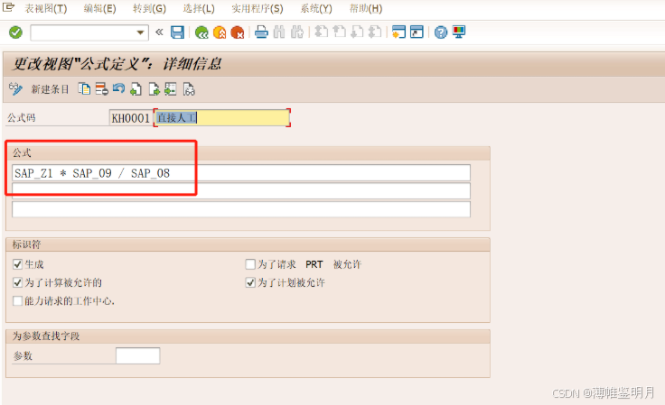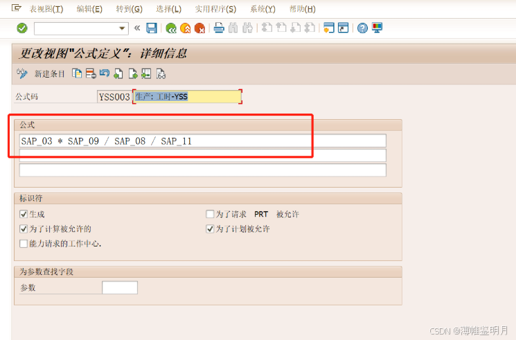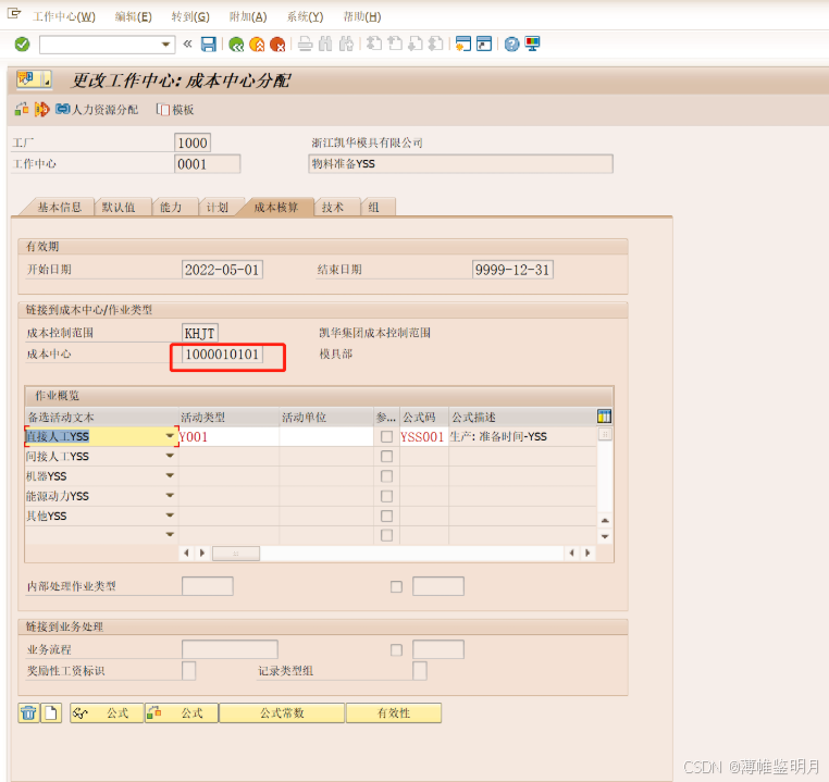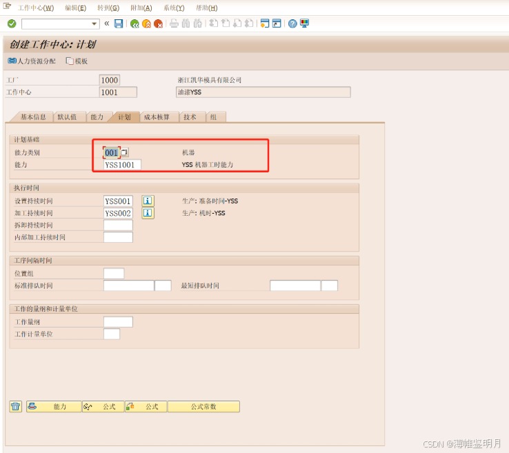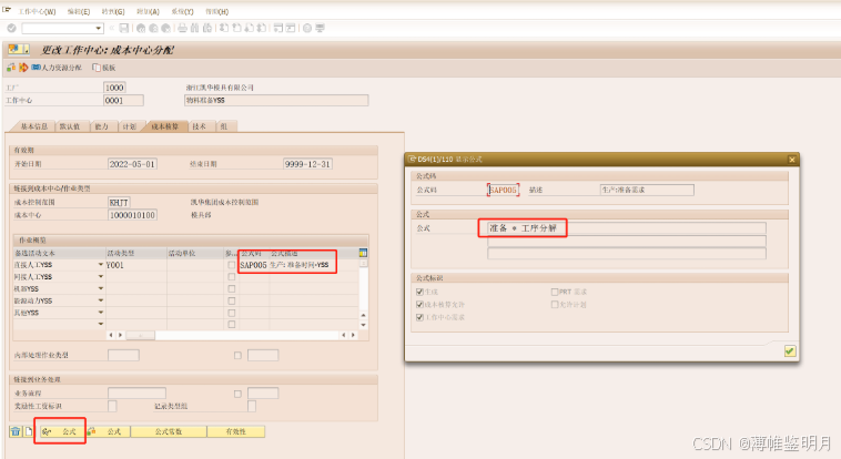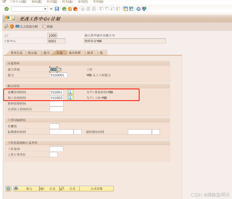 持续时间:是指该工作中心生产订单排程时,准备时间的计算公式是怎样的,我们COPY了一个SAP系统标准的“SAP001”准备排程计算公式,我们可以点击旁边的感叹号,查看具体的公式。