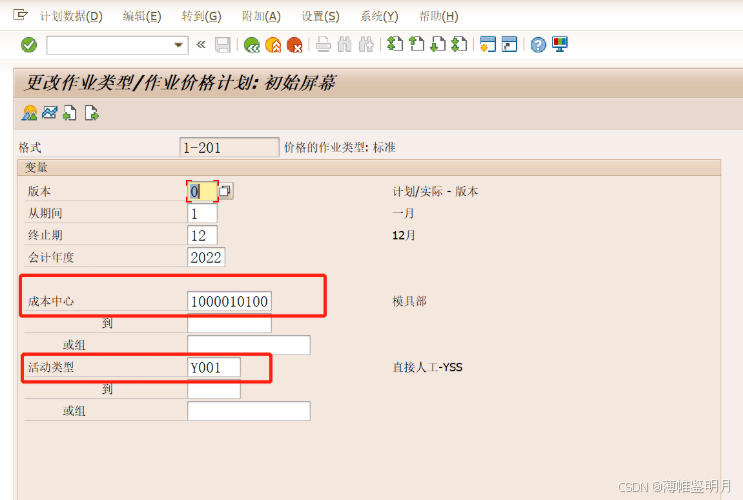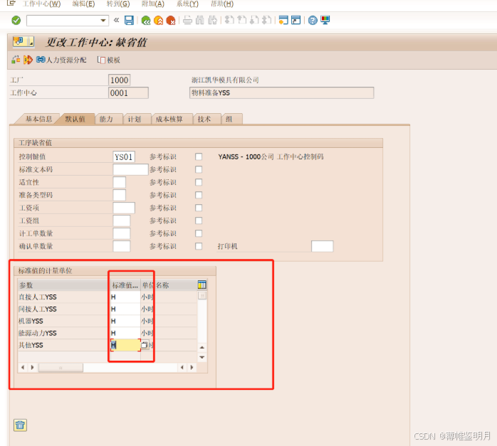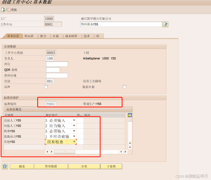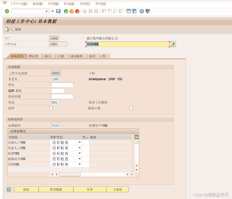 标准值代码:定义了这个工作中心有几项标准的操作,如准备、机器操作、人工工时等。这里我们选择SAP系统标准的一般生产标准码,标准值码是在后台可以配置的。