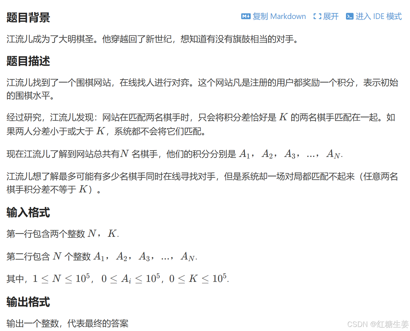 那就将一个数 i 的 i+k , i-k ,就是前后相差k的数的个数减去,这样子 i 就不存在能够相互匹配的对手了,然后用一个数match记录,match++,