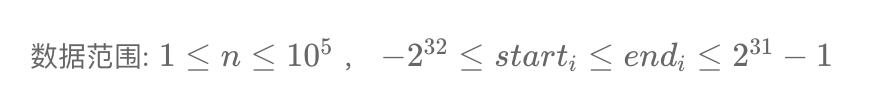 数据范围: 1≤n≤1051≤n≤105 , −232≤starti≤endi≤231−1−232≤starti≤endi≤231−1复杂度要求:时间复杂度 O(nlogn)O(nlogn) ,空间复杂度 O(n)O(n)