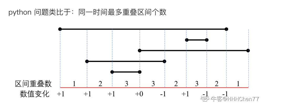 public int minmumNumberOfHost(int n, int[][] startEnd) {if (n == 0 || n == 1) {return n;}List<Interval> intervalList = new ArrayList<>();for (int i = 0; i < n; i++) {intervalList.add(new Interval(Long.valueOf(startEnd[i][0]),Long.valueOf( startEnd[i][1])));}intervalList.sort((o1, o2) -> {if (o1.start == o2.start) {return o1.end - o2.end > 0 ? 1 : (o1.end == o2.end ? 0 : -1);} else {return o1.start - o2.start > 0 ? 1 : -1;}});List<Long> endNumList = new ArrayList<>();int num = 1;for (int i = 1; i < intervalList.size(); i++) {// 出现交集if (intervalList.get(i).start < intervalList.get(i - 1).end) {// 记录上一个人的结束时间endNumList.add(intervalList.get(i - 1).end);Arrays.sort(new List[]{endNumList});endNumList.sort((o1, o2) -> o1 - o2 > 0 ? 1 : (o1 == o2 ? 0 : -1));// 判断是否有空闲的人 主持当前时间段if (endNumList.size() > 0 && endNumList.get(0) <= intervalList.get(i).start) {endNumList.remove(0);} else {num++;}}}return num;}public static class Interval {Long start;Long end;public Interval(Long start, Long end) {this.start = start;this.end = end;}}