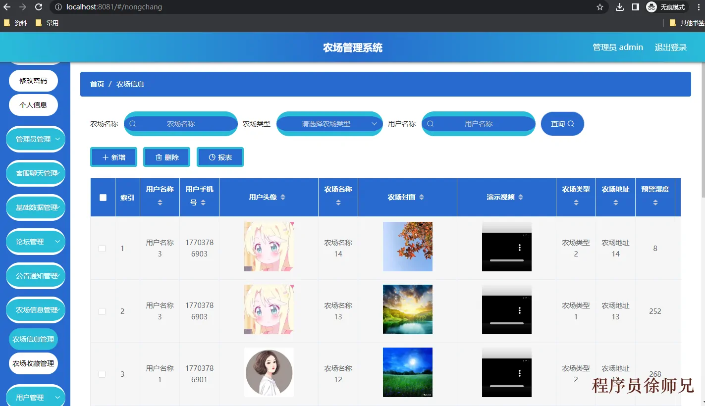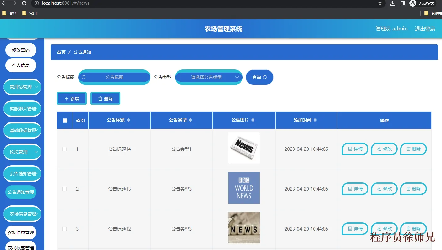 如图4.2显示的就是农场信息管理页面,此页面提供给管理员的功能有:查看已发布的农场信息数据,修改农场信息,农场信息作废,即可删除,还进行了对农场信息名称的模糊查询 农场信息信息的类型查询等等一些条件。