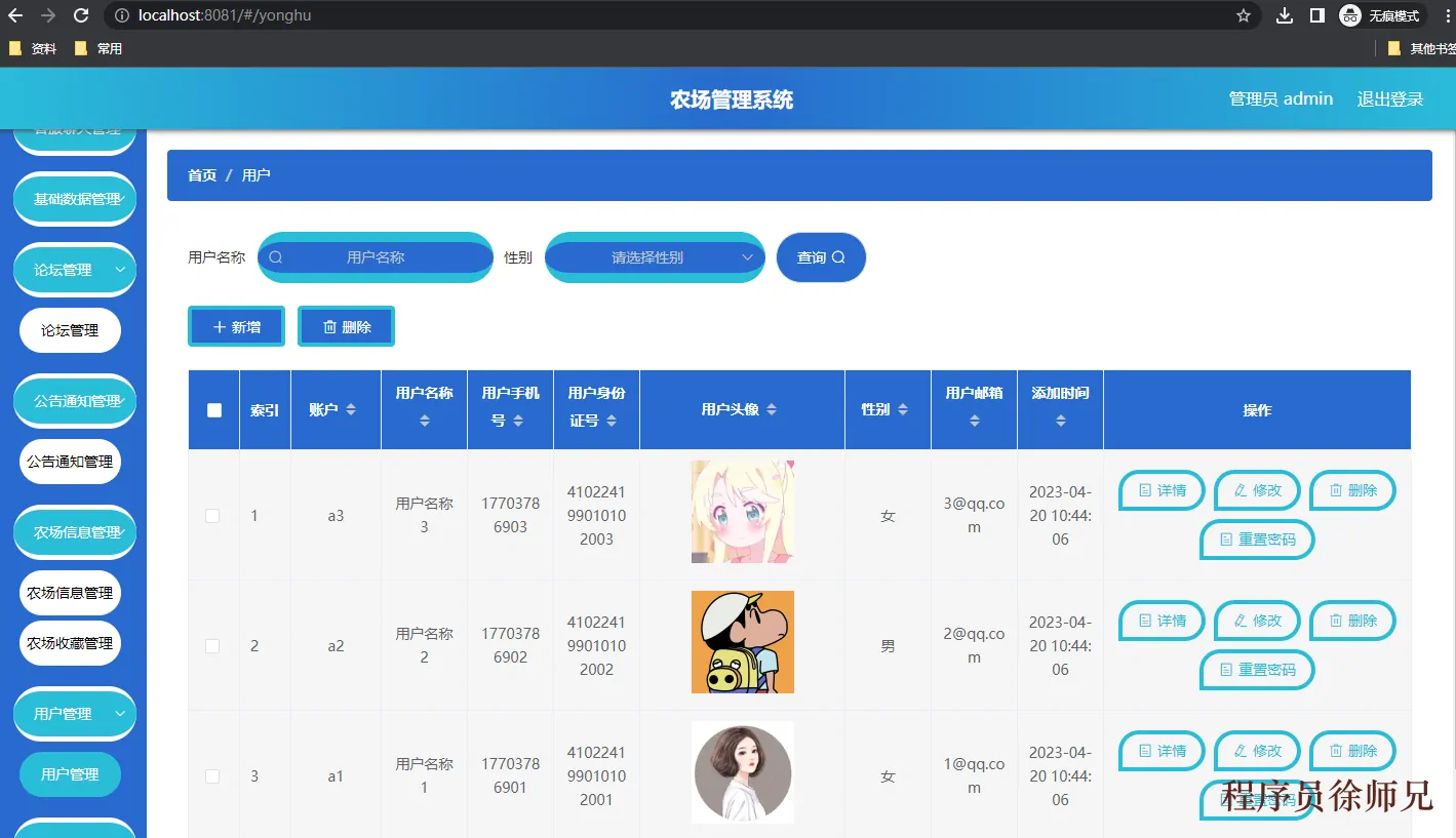 如图4.1显示的就是用户信息管理页面,此页面提供给管理员的功能有:用户信息的查询管理,可以删除用户信息、修改用户信息、新增用户信息,