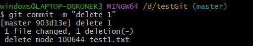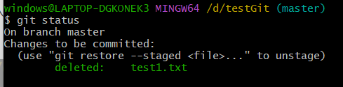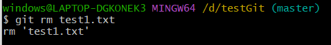 使用git rm test.txt命令,删除的文件直接进入暂存区。(此刻需要注意,如果使用rm删除不在暂存区,需要git add才会进入暂存区。如果进入暂存区可以退回工作区,使用下面命令 git reset HEAD test.txt)