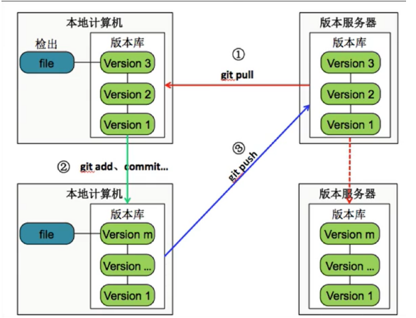 - 把本地主分支提交到远程库:生成补丁(patch),把补丁发送给远程库。