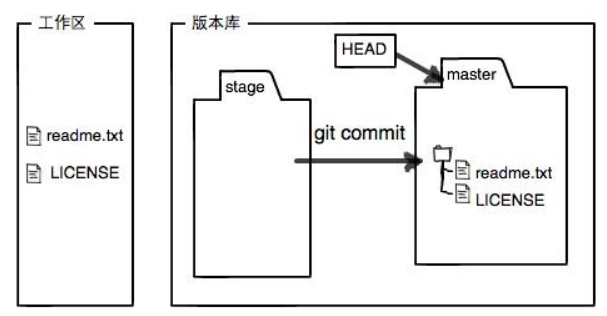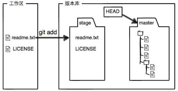 Git的版本库里存了很多东西,其中最重要的就是称为stage(或者叫index)的暂存区,还有Git为我们自动创建的第一个分支master,以及指向master的一个指针叫HEAD。
