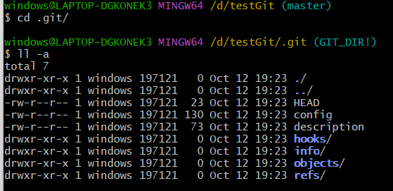你当前testgit目录下会多了一个.git的目录,这个目录是Git来跟踪管理版本的,没事千万不要手动乱改这个目录里面的文件,否则,会把git仓库给破坏了。.git里面内容如下: