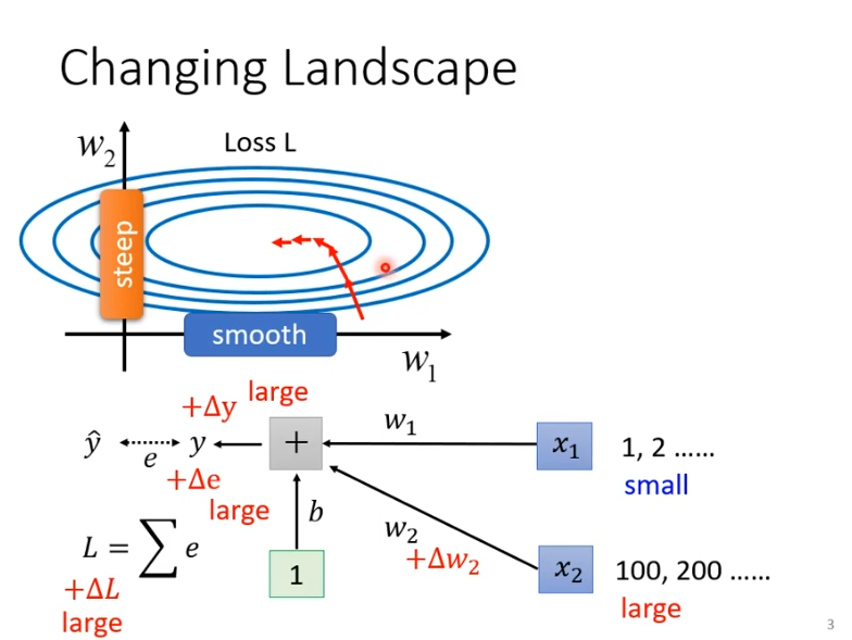的距离即为loss。假设x1输入都很小,w1变化对loss的影响就很小,就导致了w1斜率变化小;假设x2输入都很大,w2变化对loss的影响就很大,就算w2变化很,但是因为乘上了x2,所以loss变化很大,也就导致了w1斜率变化大。所以当我们的输入范围差距很大就会出现上述的这种情况。