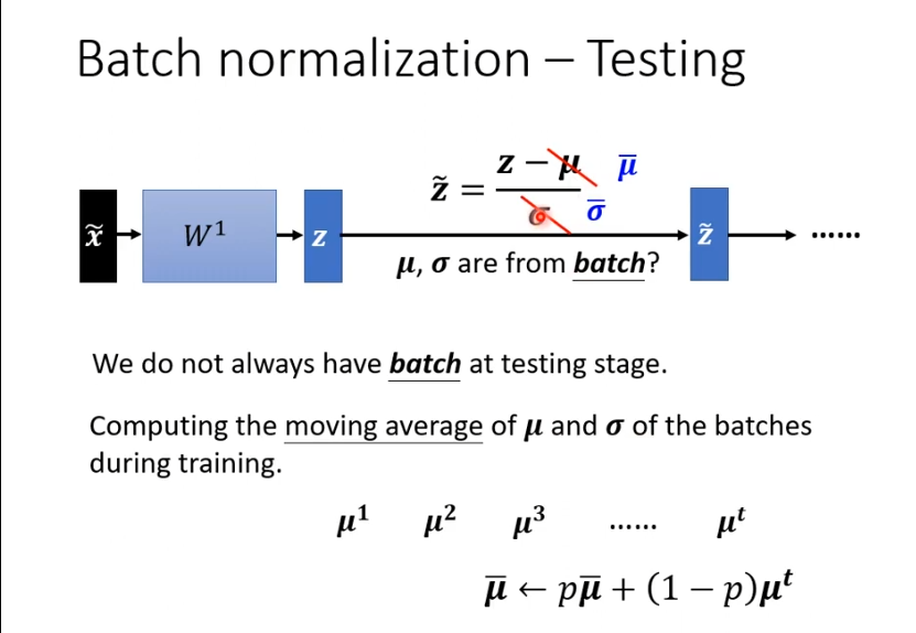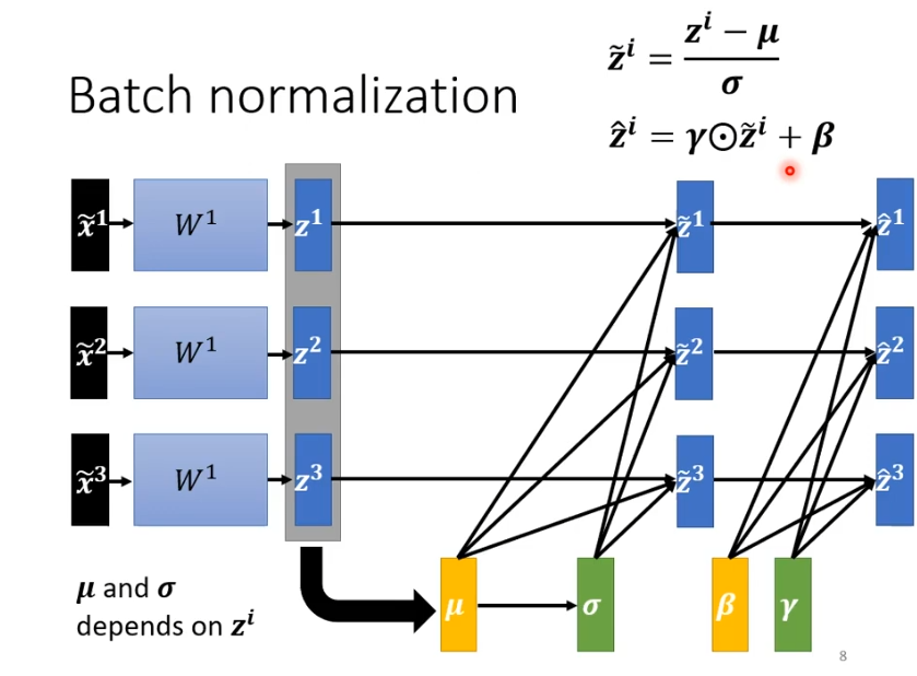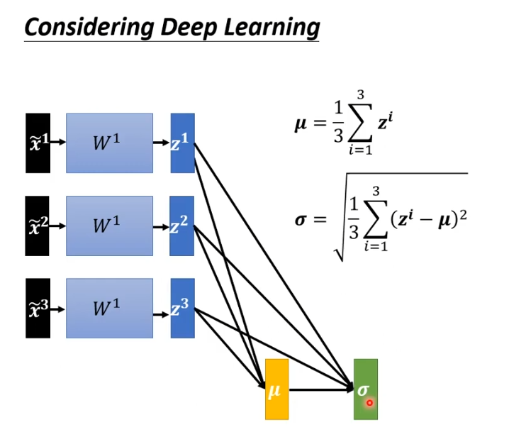 导致,z2,z3也被更改。实际操作时,我们会让network考虑一个batch,因此我们是对一个batch里的数据做normalization,这也叫做batch normalization,适用于batch比较大的时候。