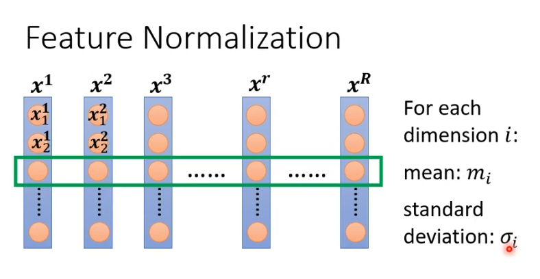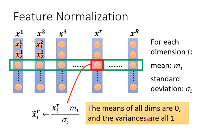 那我们让输入有相同的范围就可以使其变得更好训练, 一种做法是把所有的feature vector都集合起来,那我们把同一个dimension(维度)不同训练资料的feature vector的数值取出来,计算出均值记为,再计算他们的standard deviation(标准差)记为