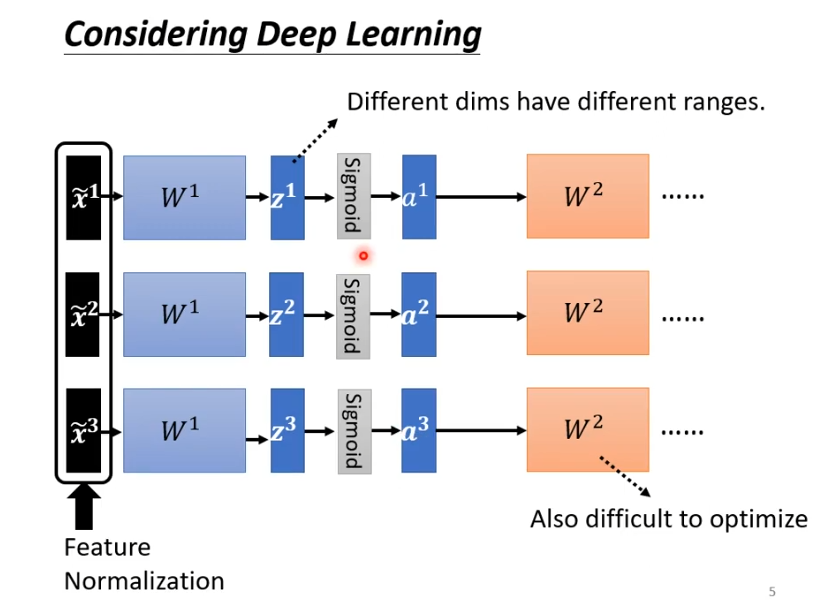 当我们完成feature normalization后,通过layer 1,得到z,通过sigmoid或Relu得到a,再通过下一层,对第二层W2来说,实际上的输入是a,为上一层的输出,输出并没有做feature normalization,所以我们需要对a或z做feature normalization。