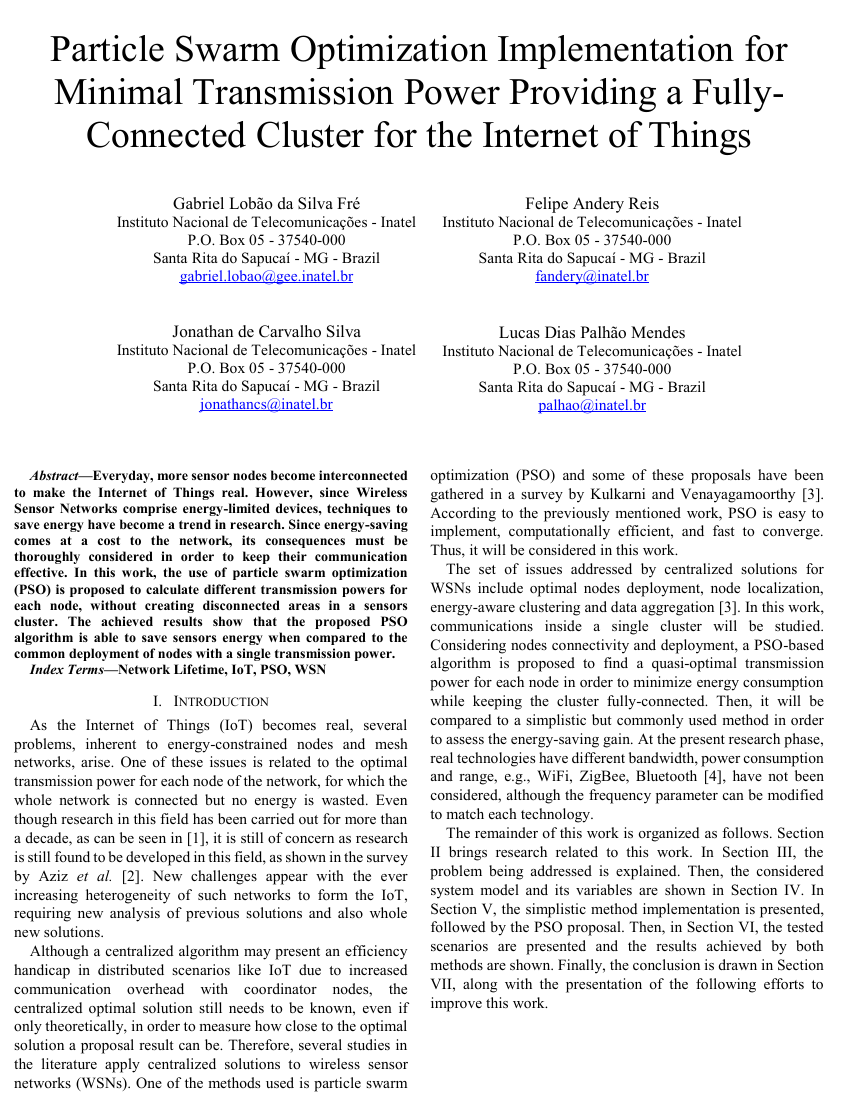 文章题目:Particle swarm optimization implementation for minimal transmission power providing a fully-connected cluster for the Internet of Things