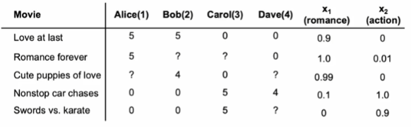 假设我们此时引入一个新用户,该用户没有对任何一部电影进行过评分。如果按照之前的模型,由于在成本函数中引入了正则化项,且该用户没有评分,即成本函数第一项没有用任何影响,那么此时得出的,而