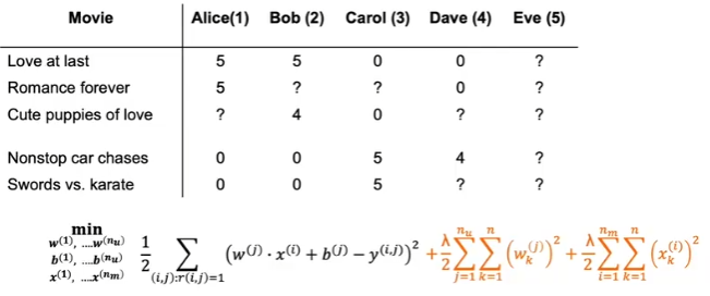 实际上,上述的三个参数都是未知量,因此引入协同过滤算法,则三个参数下的成本函数可以表示为: