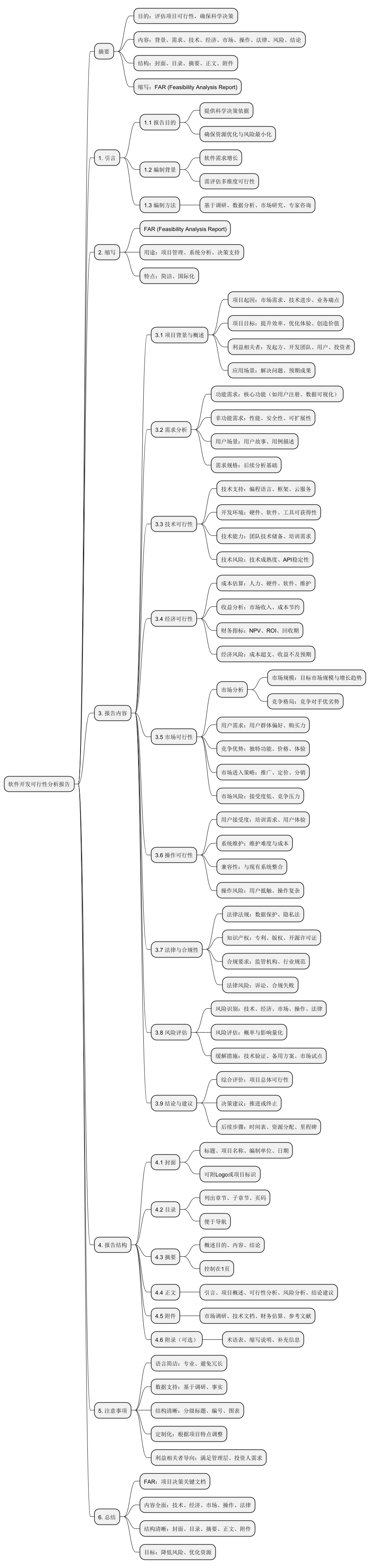 软件开发的《可行性分析报告》英文常用:FSR(Feasibility Study Report,强调“报告”);也有场景使用 FAR(Feasibility Analysis Report,强调“分析”) 是项目启动前评估其可行性的核心文档,旨在通过技术、经济、市场、操作和法律等多维度分析,确保项目决策科学合理。其目标是判断项目是否值得投资、风险是否可控,并为后续开发提供依据。报告内容包括项目背景、需求分析、技术可行性、经济可行性、市场可行性、操作可行性、法律可行性、风险评估及结论建议。结构由封面、目录、摘要、正文和附件组成,逻辑严谨、信息全面。本文档详细阐述FAR的缩写、内容及结构,供项目管理者及开发团队参考。