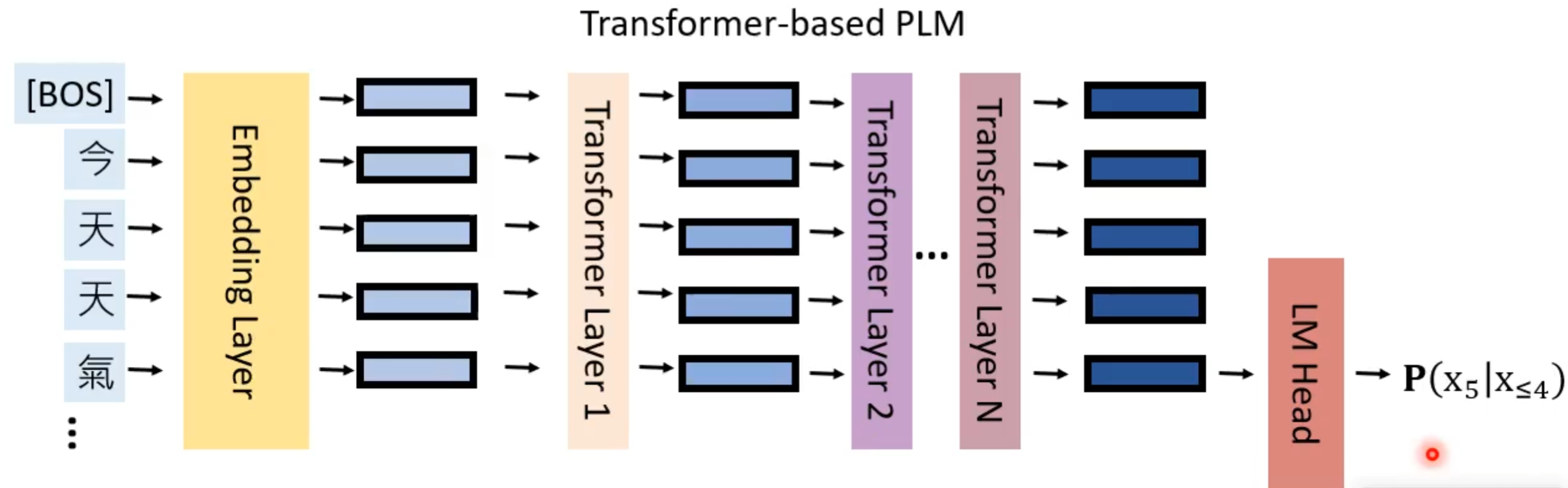 那这个模型的架构是基于Transformer,并由Transformer堆叠形成的。所以这个模型是先输入一个句子,这个句子中有许多token,包括特殊的BOS表示开始。这些token就经过嵌入层转换成对应一个一个向量,然后将这些向量输入到一层又一层的transformer中,知道最后一层就会抽出最后的embeddings,若想预测下一个字就需要将最后一个embedding,输入到语言模型输出层(language model head),得到下一个字的概率分布,这个其实也是一种自注意机制。