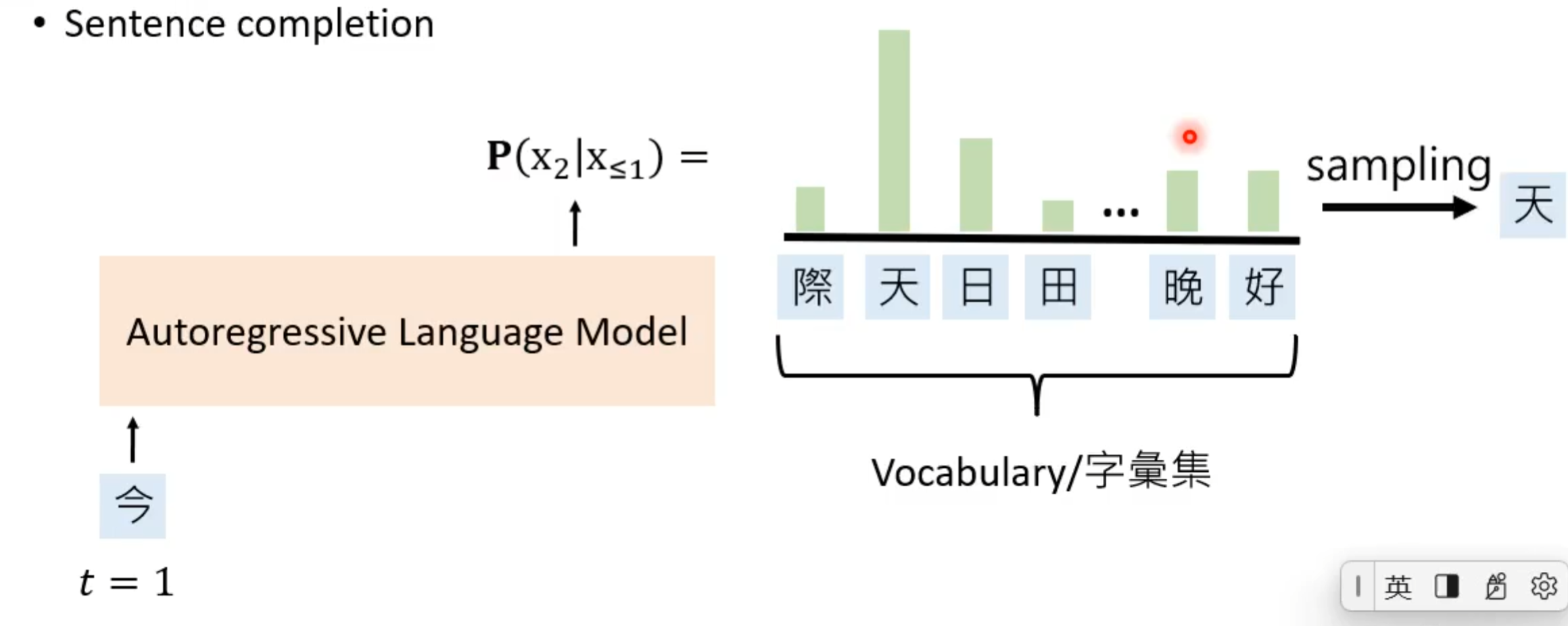 ① 自回归语言模型(Autoregressive Language Model),其实通过给出的前半段的句子去补上后半段的句子。就如去预测“今天天气真好”,当输入第一个“今”,其就要通过这个字去预测下一个字,这个预测就是通过第一个字后模型得到第二个字的概率分布,这个概率分布是在字符集上的一个离散分布,然后再在这个分布中抽取一个字。